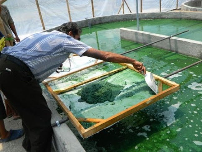 Sáng sớm là thời điểm mà những tảo xoắn khỏe nhất nổi lên và tạo thành lớp váng tảo. Người nuôi tảo gạt nhẹ và lóng nước lấy lớp tảo này.