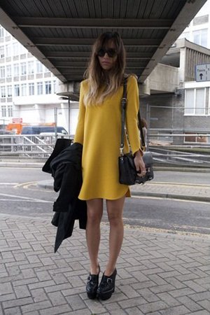 | Váy liền ngắn để lộ đôi chân dài được kết hợp với bốt cao và áo choàng dài |