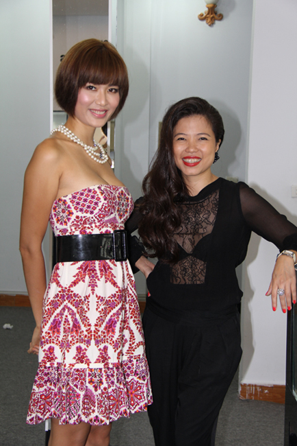 Nhà thiết kế Hà Linh Thư đi dự tiệc cùng Thu Thủy và chị cũng khá tự tin khi diện một chiếc áo ren đen mỏng khoe khéo vòng 1. Cả hai tỏ ra thích thú khi nhìn những viên kim cương nhân tạo, kim cương thật được trang trí nghệ thuật trên những chiếc điện thoại đắt tiền.