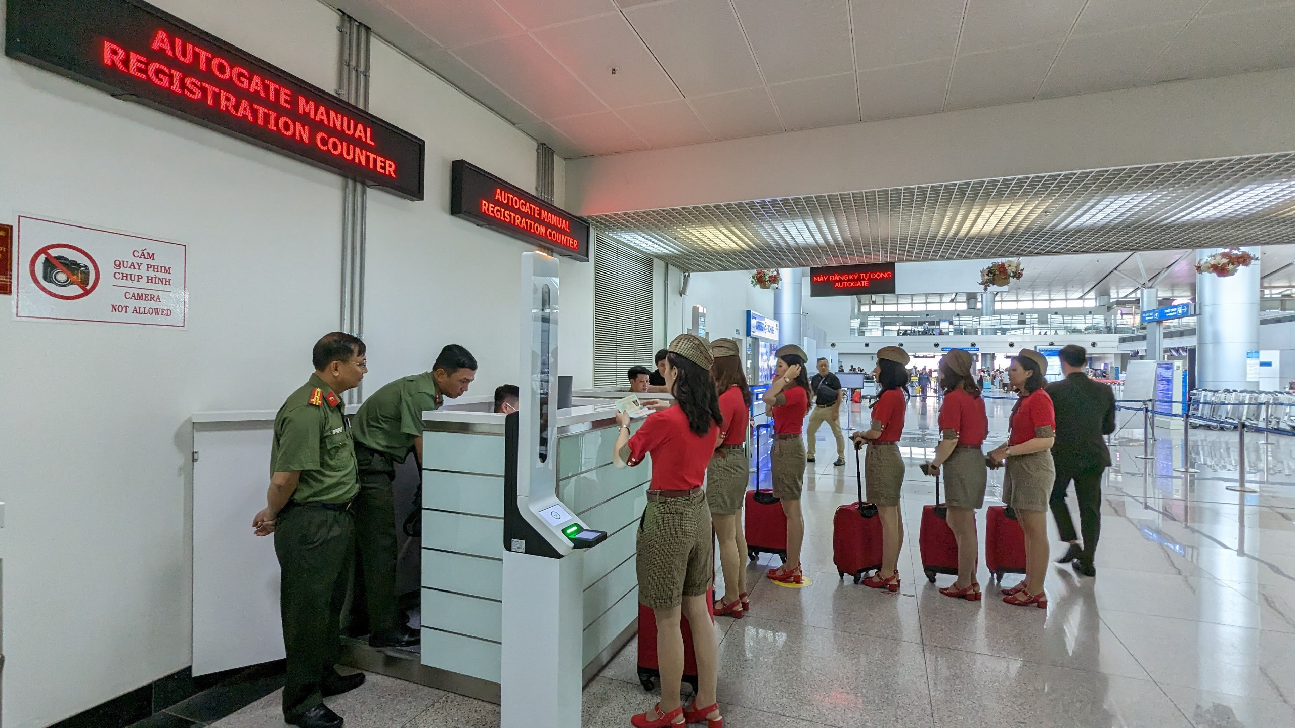 Tiếp viên hàng không thực hiện thủ tục tại hệ thống Autogate.Tại cửa số 1, hành khách úp thẻ lên tàu (boarding pass) vào máy đọc để chuẩn bị bước vào khu vực quan trắc sinh học gương mặt.