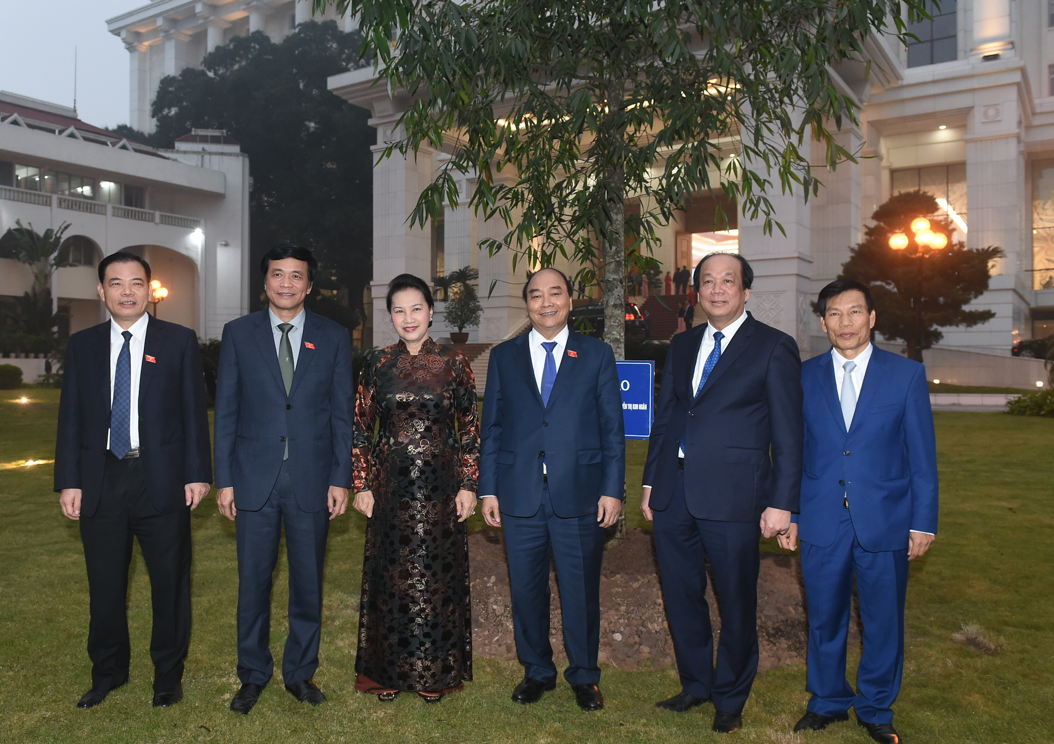 Thủ tướng Nguyễn Xuân Phúc, Chủ tịch Quốc hội Nguyễn Thị Kim Ngân cùng các đại biểu trồng cây lưu niệm tại Văn phòng Chính phủ. Ảnh: VGP/Quang Hiếu |