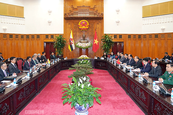 Đánh giá cao sự chia sẻ tin cậy giữa hai nước về quan điểm và tầm nhìn đối với các vấn đề khu vực, quốc tế cùng quan tâm, Thủ tướng khẳng định ưu tiên và mong muốn cùng với Brunei tiếp tục thúc đẩy việc thực hiện Tầm nhìn Cộng đồng ASEAN 2025, nhất là thời gian tới khi Việt Nam làm Chủ tịch ASEAN năm 2020 và Brunei làm Chủ tịch ASEAN năm 2021, cùng phối hợp bảo đảm đoàn kết, tự cường, phát triển và vai trò trung tâm của ASEAN; giữ đồng thuận ASEAN trong các vấn đề cốt lõi, chiến lược của khu vực.