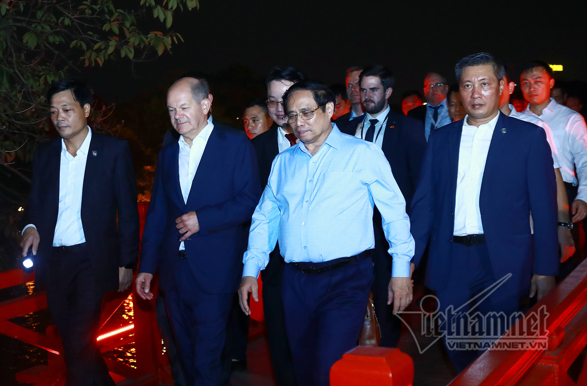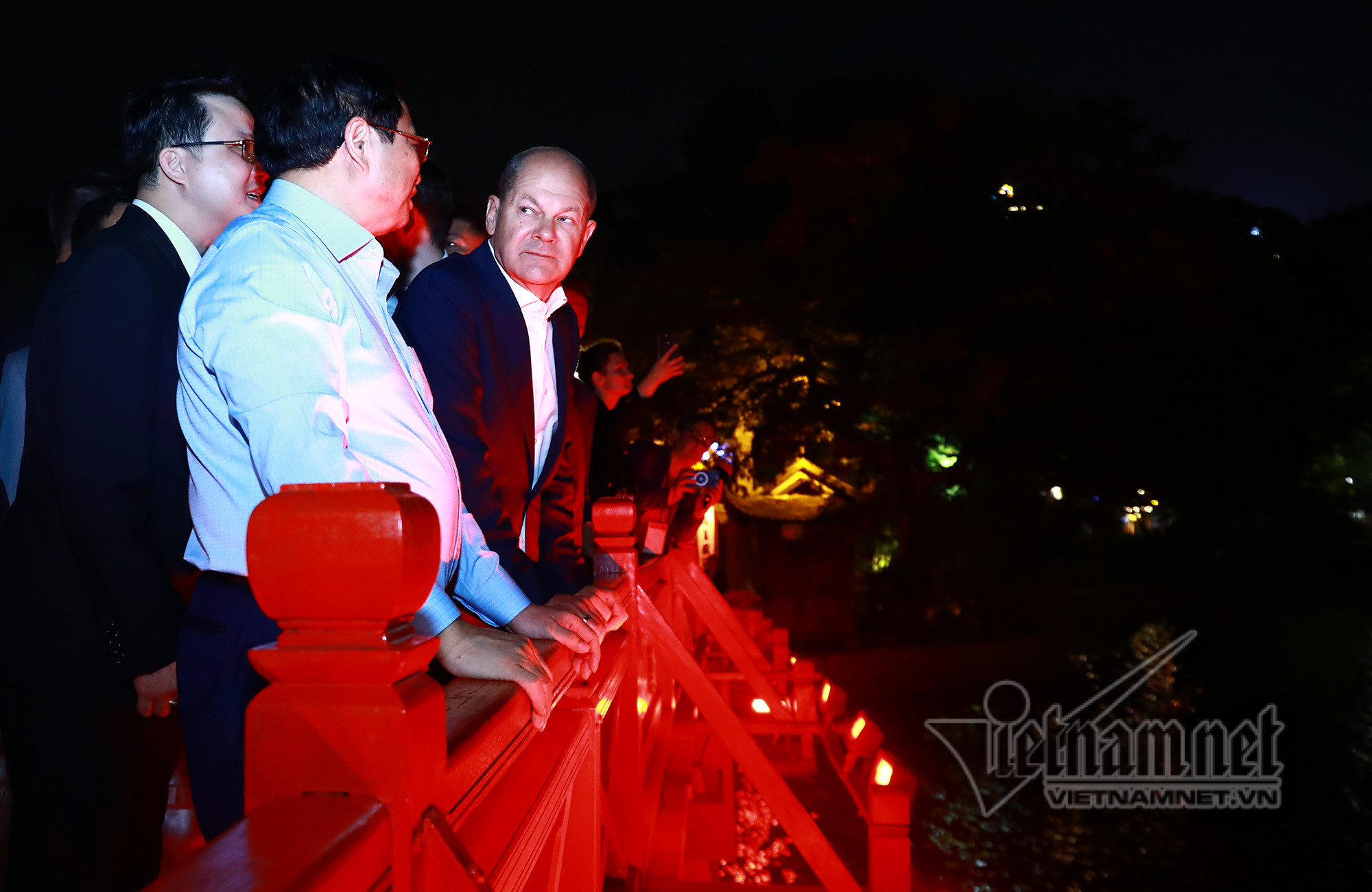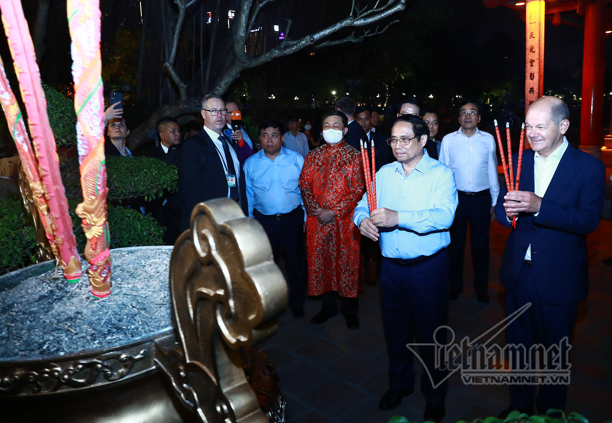 Đến cổng đền Ngọc Sơn, Thủ tướng Phạm Minh Chính đã chờ đón Thủ tướng Olaf Scholz. Hai nhà lãnh đạo cùng đi trên cầu Thê Húc vào trong đền.