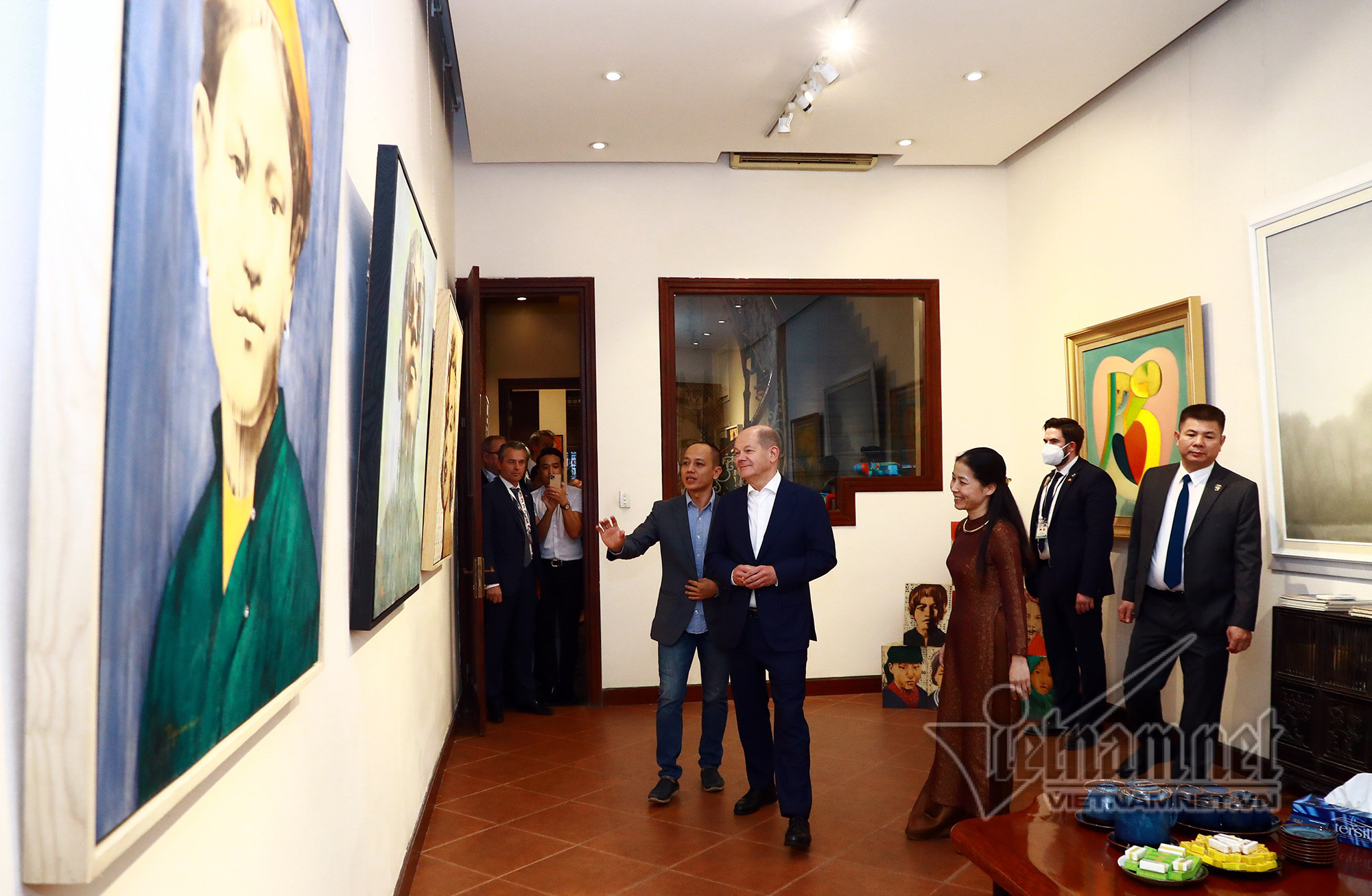 Giữa một lịch trình dày đặc trong chuyến thăm chính thức Việt Nam (13-14/11), tối nay Thủ tướng Đức Olaf Scholz đã đến phòng tranh Thang Long Art Gallery (41 Hàng Gai, quận Hoàn Kiếm) để chiêm ngưỡng các tác phẩm nghệ thuật của các họa sĩ nổi tiếng cũng như các tác phẩm mới lạ của những họa sĩ trẻ tài năng Việt Nam.