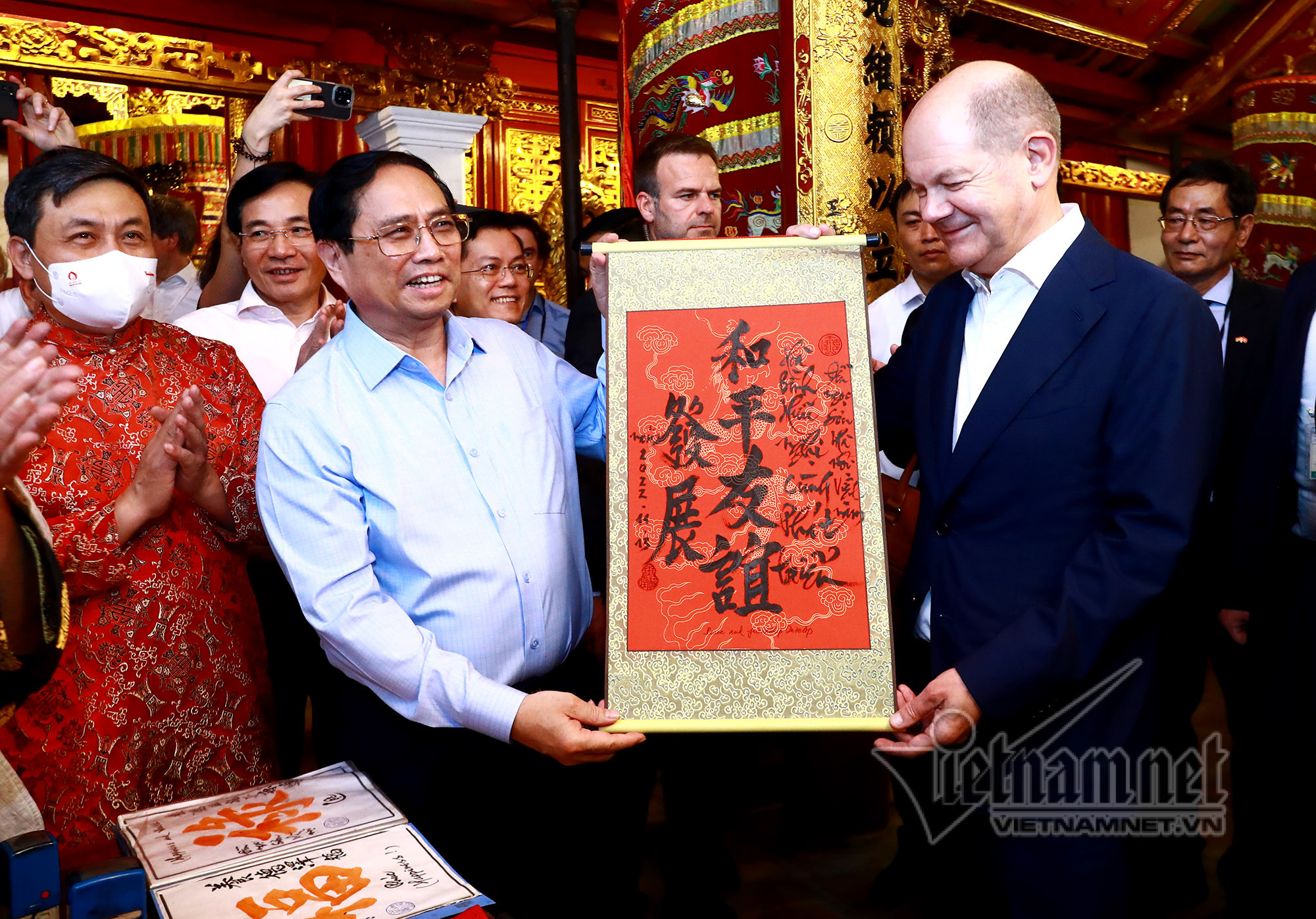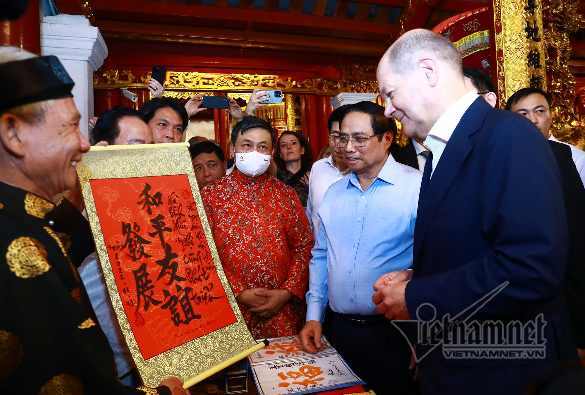 Thủ tướng Olaf Scholz sau đó dừng lại trước bàn xin chữ thư pháp, nơi ông được tặng bức thư pháp với nội dung: "Hoà Bình hữu nghị cùng phát triển - Đền Ngọc Sơn Hà Nội Việt Nam".