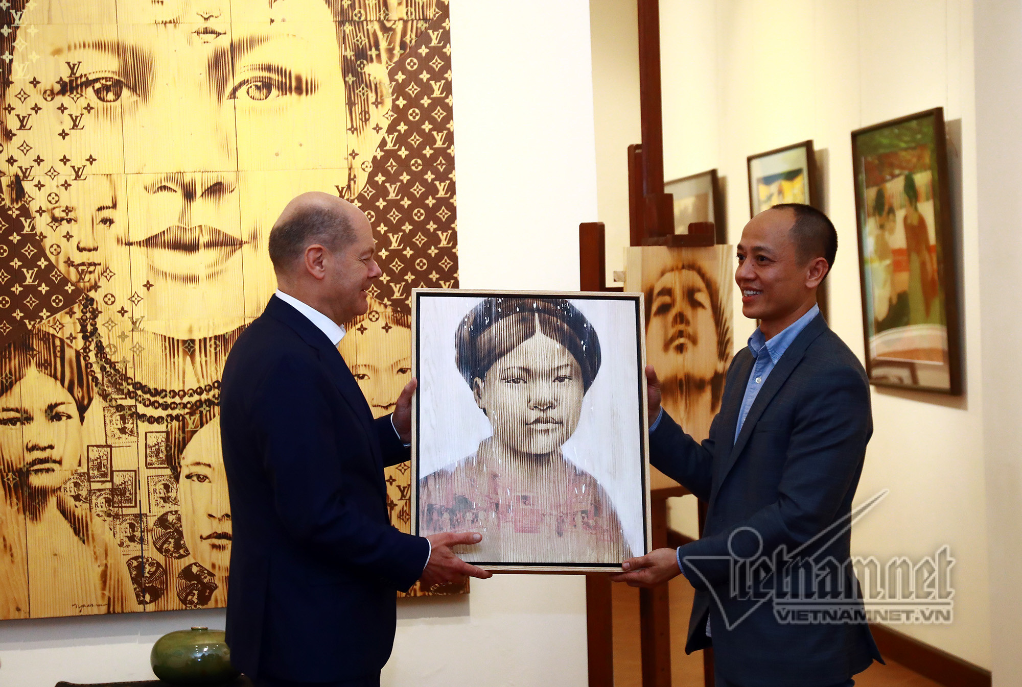 Kết thúc chuyến tham quan, họa sĩ Ngô Văn Sắc tặng Thủ tướng Đức hai bức tranh đó là bức người phụ nữ Việt Nam xưa và bức tự họa do chính họa sĩ tạo ra trước sự chứng kiến của Thủ tướng Olaf Scholz.