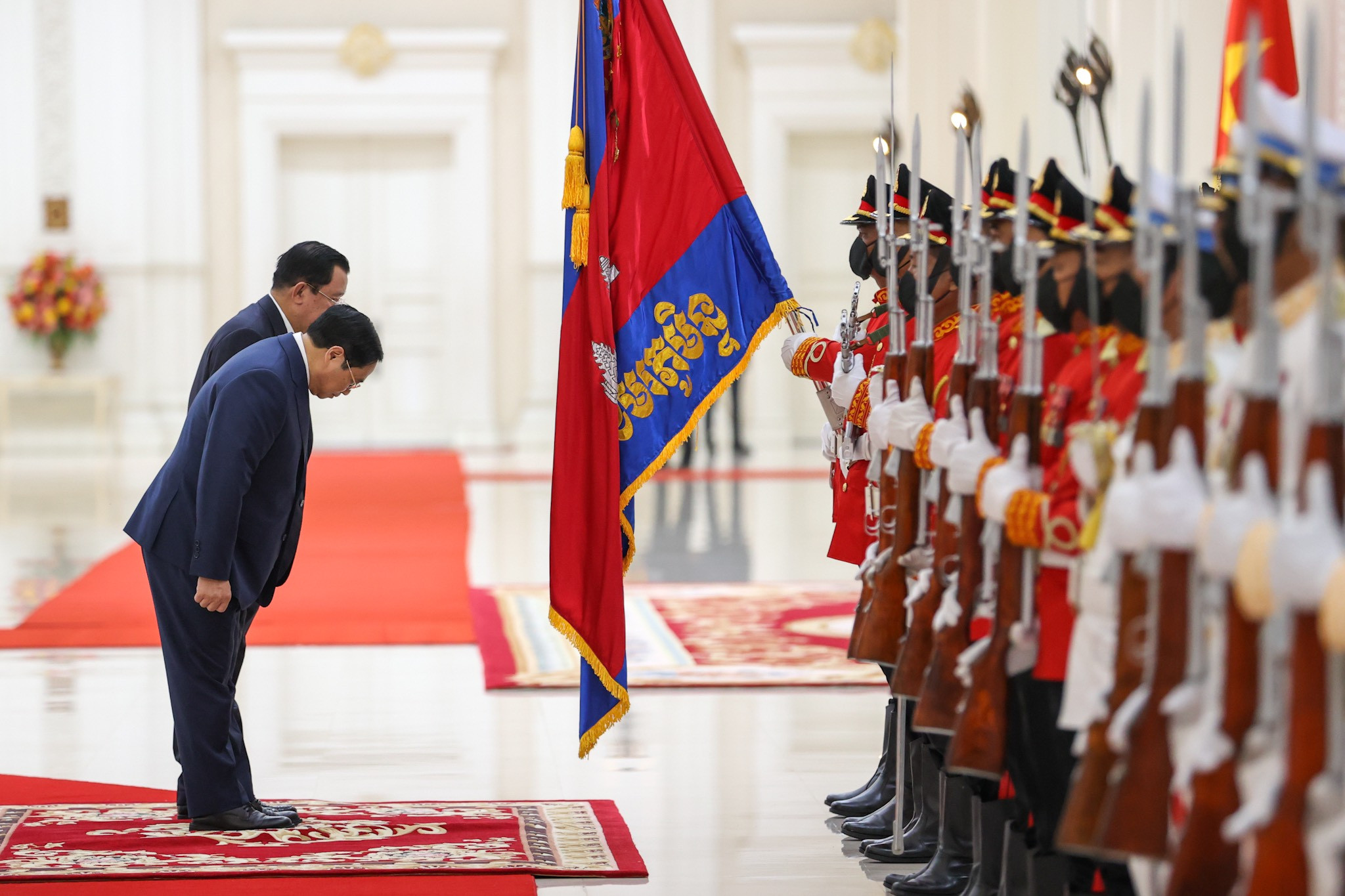 Sáng nay, tại Cung Hòa Bình, Thủ đô Phnom Penh, Thủ tướng Samdech Techo Hun Sen chủ trì lễ đón Thủ tướng Phạm Minh Chính và đoàn đại biểu cấp cao Việt Nam thăm chính thức Campuchia.
