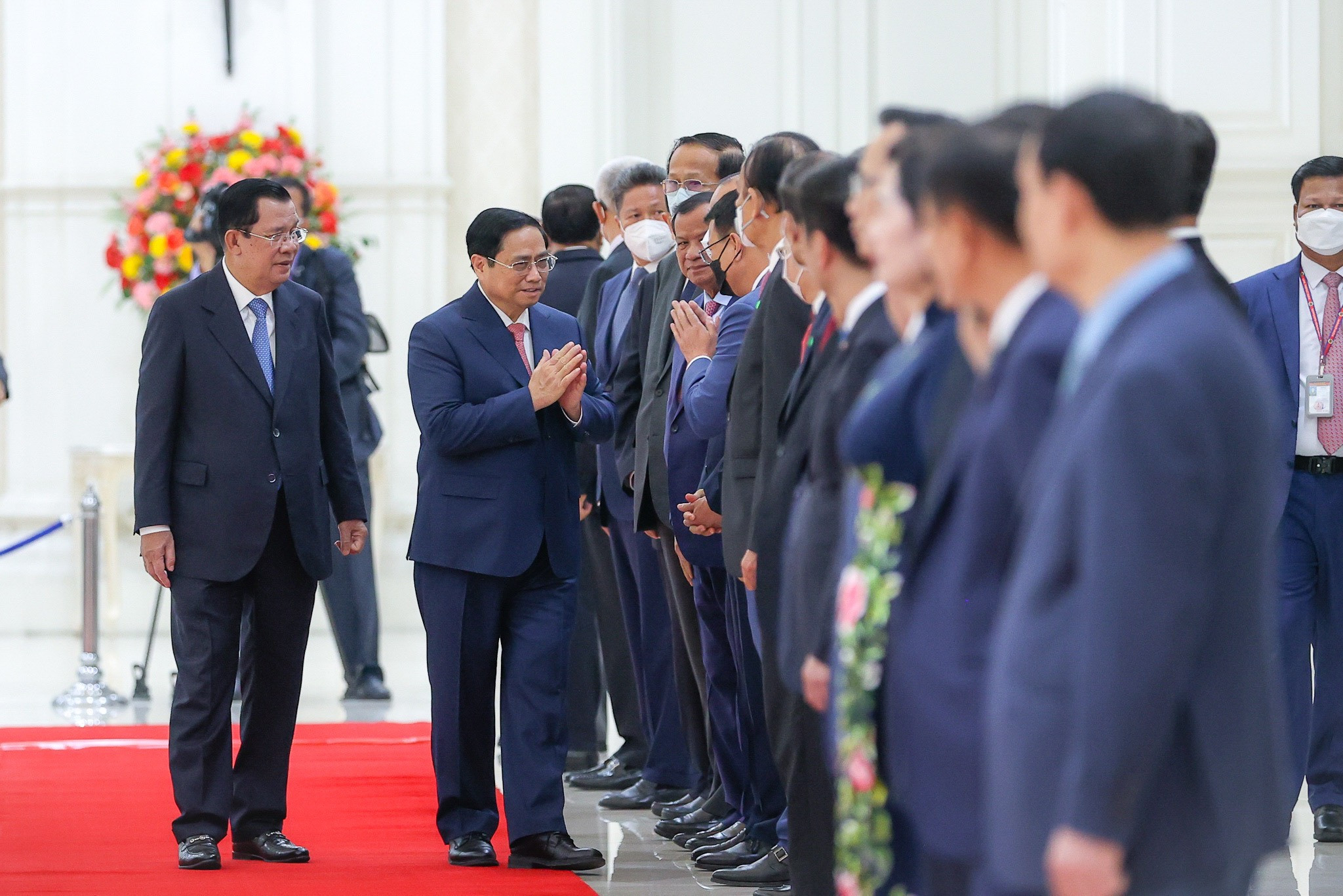 Thủ tướng Hun Sen và Thủ tướng Phạm Minh Chính tại lễ đón chính thức Hai Thủ tướng chào quân kỳ Quân đội hoàng gia CampuchiaThủ tướng hai nước duyệt Đội danh dự Quân đội Campuchia Thủ tướng Hun Sen giới thiệu với Thủ tướng Phạm Minh Chính về lãnh đạo các bộ, ngành phía Campuchia tham dự lễ đónThủ tướng Phạm Minh Chính giới thiệu với Thủ tướng Hun Sen thành phần phía Việt Nam tham dự lễ đónLãnh đạo cấp cao Việt Nam - Campuchia đã thống nhất đề ra phương châm mới trong phát triển quan hệ song phương: “Láng giềng tốt đẹp, hữu nghị truyền thống, hợp tác toàn diện, bền vững lâu dài”.Sau lễ đón, Thủ tướng Phạm Minh Chính cùng Thủ tướng Hun Sen hội đàm. Ảnh: D.GiangThủ tướng Phạm Minh Chính cùng đoàn đại biểu cấp cao Việt Nam tại hội đàm. Ảnh: D.Giang