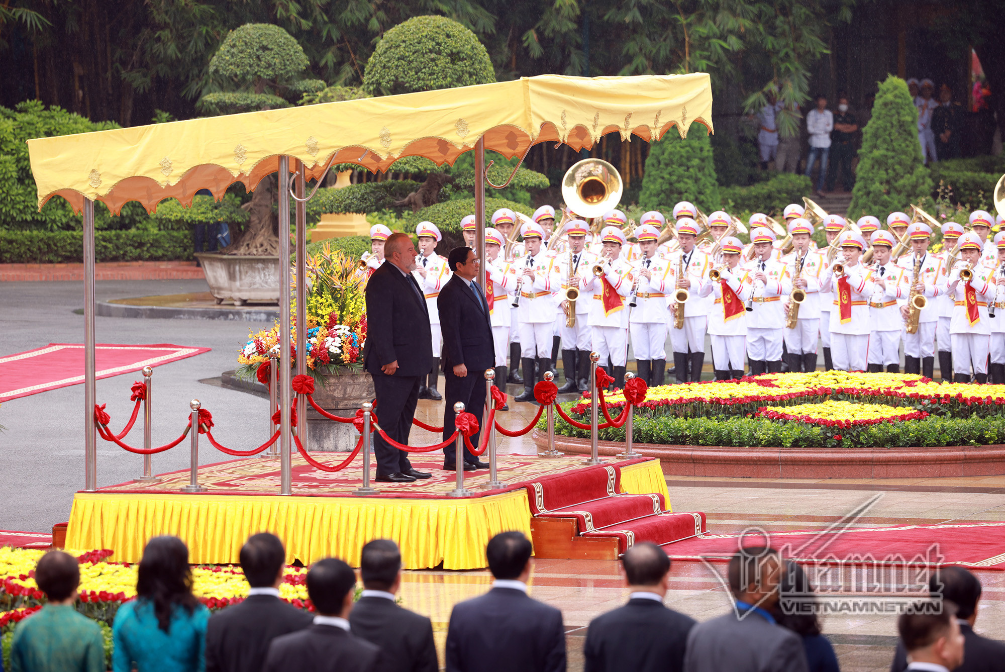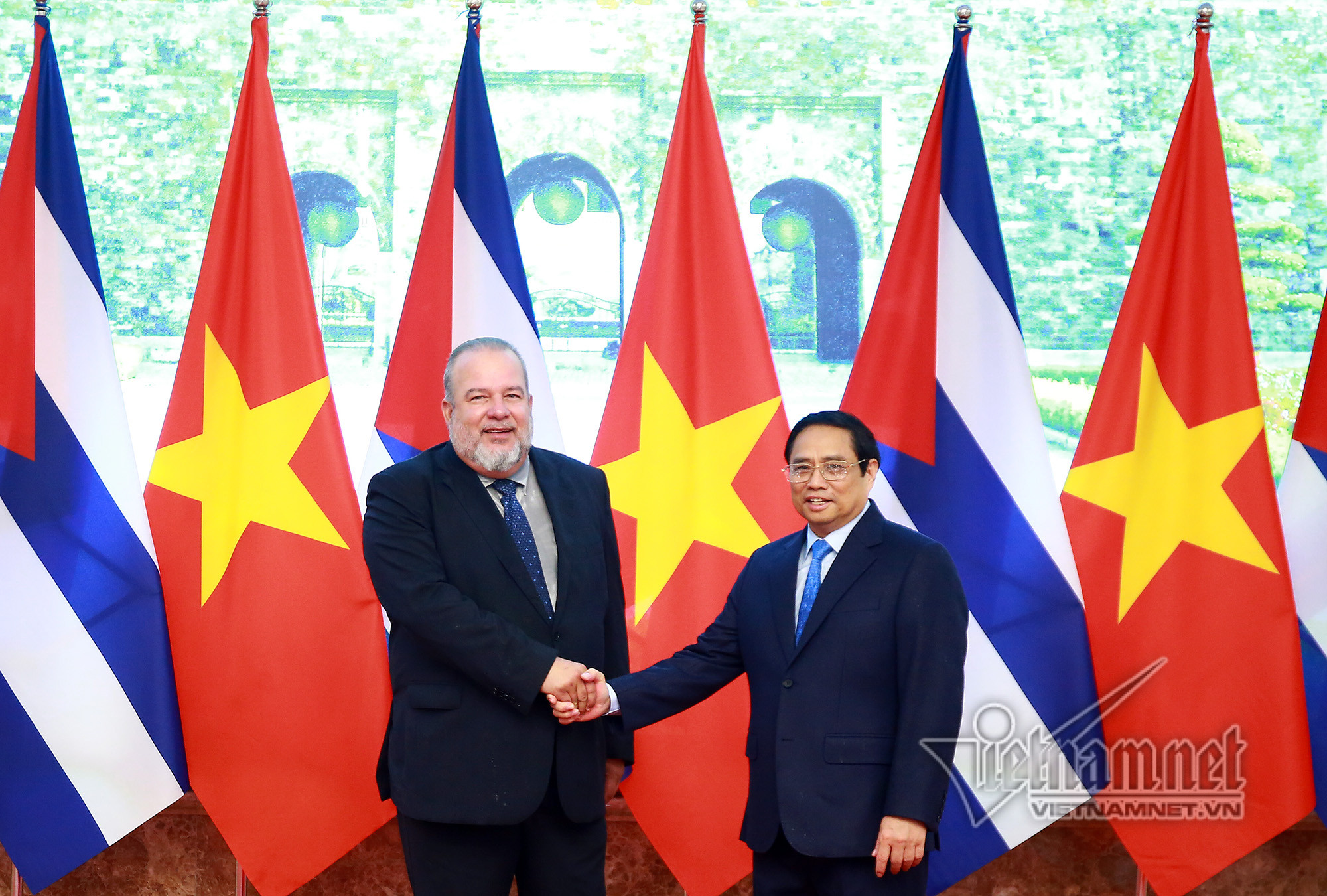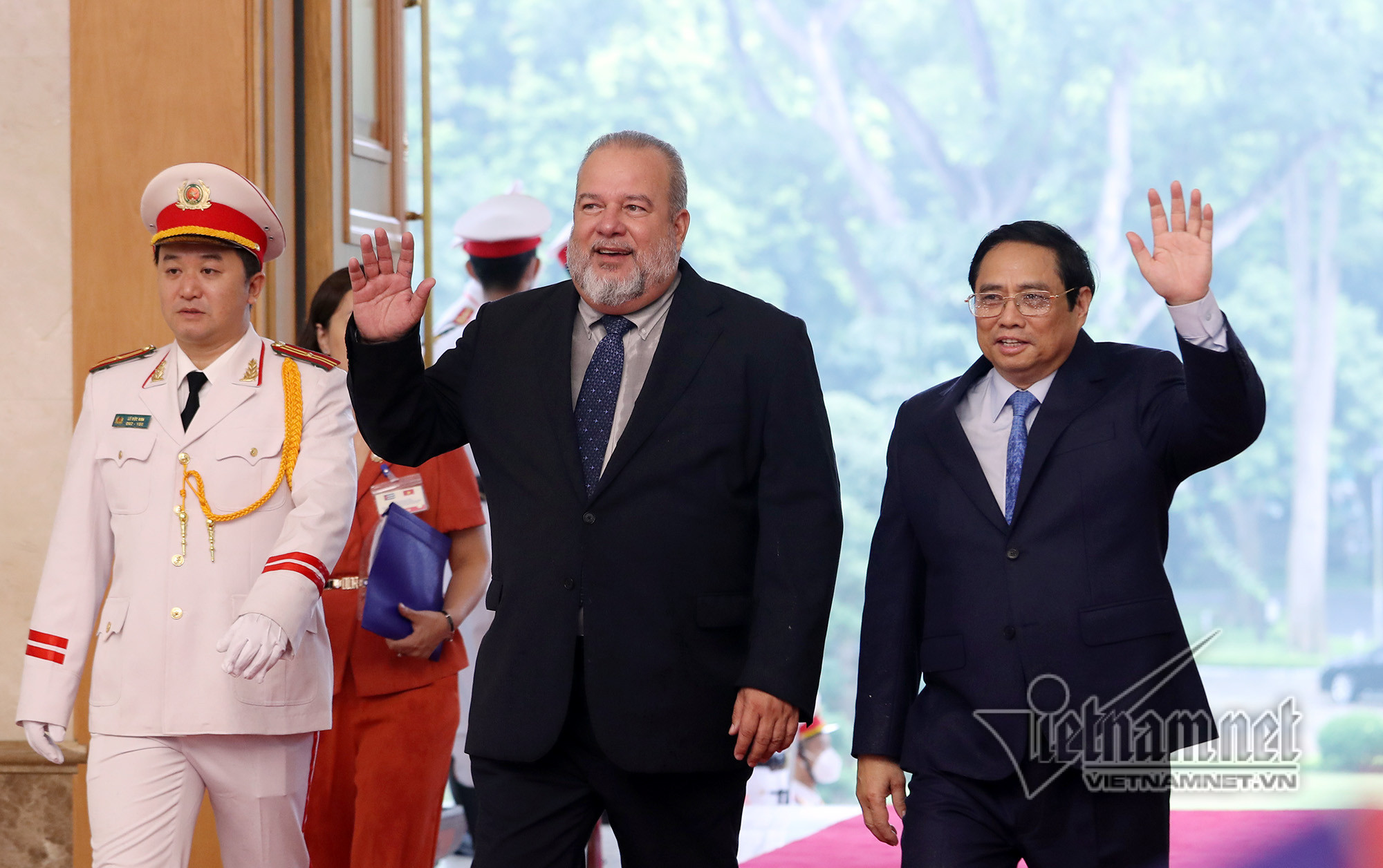 Thủ tướng Phạm Minh Chính mời Thủ tướng Manuel Marrero Cruz bước trên thảm đỏ để tới bục danh dự trong tiếng vẫy chào của các em học sinh với cờ hoa rực rỡ trên tay. Quân nhạc cử quốc thiều hai nước. Hai nhà lãnh đạo cùng bước tới chào Quốc kỳ Việt Nam.