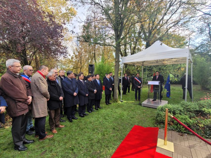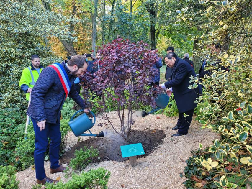 Thủ tướng Chính phủ Phạm Minh Chính cùng Thị trưởng Patrice Bessac đã cùng trồng cây lưu niệm trong khuôn viên đặt tượng đài Bác Hồ.