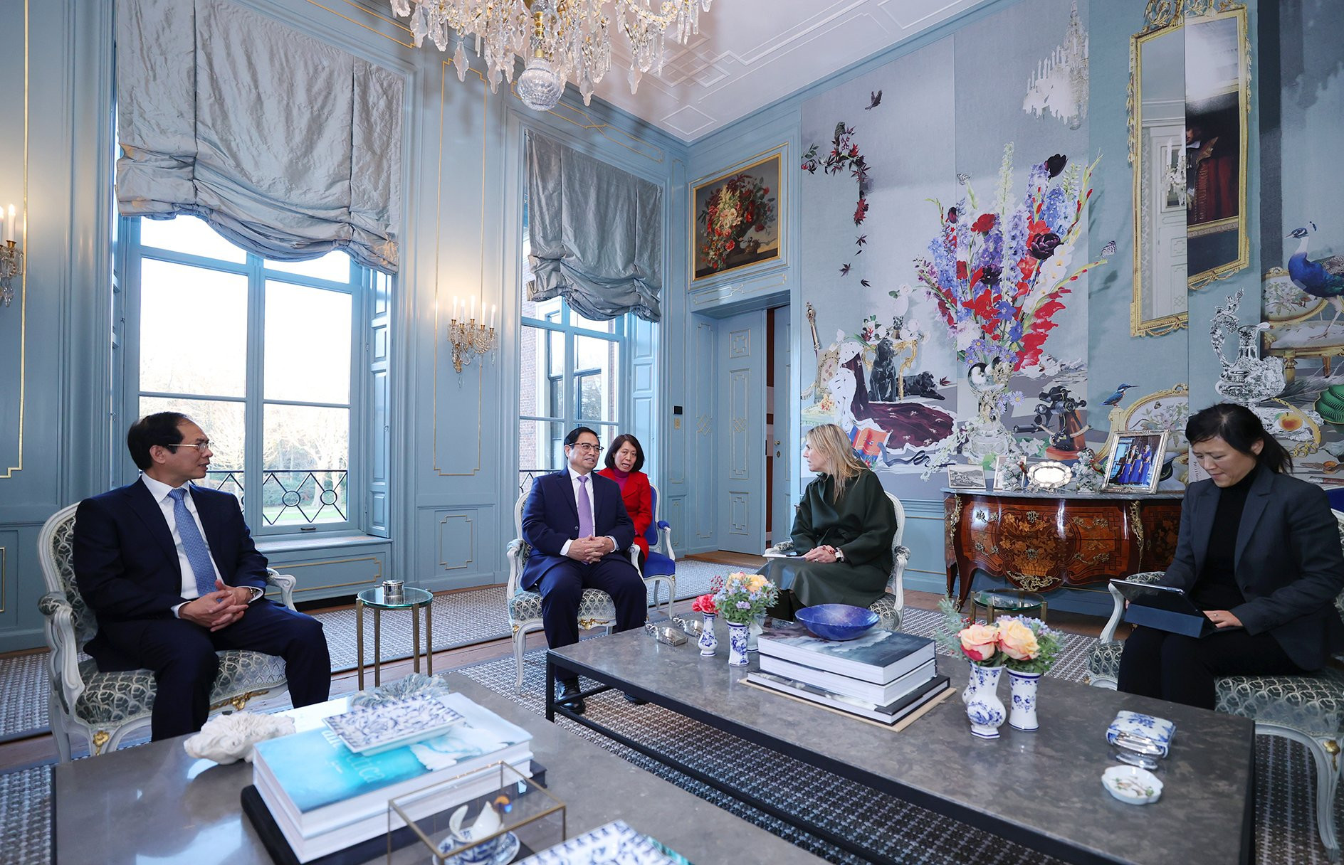 Thủ tướng hội kiến Hoàng hậu Hà Lan (ảnh 3 từ trái sang), gặp Thị trưởng thành phố Amsterdam Femke Halsema (ảnh giữa) và Tổng thư ký Tòa trọng tài Thường trực PCA tại Hà Lan.
