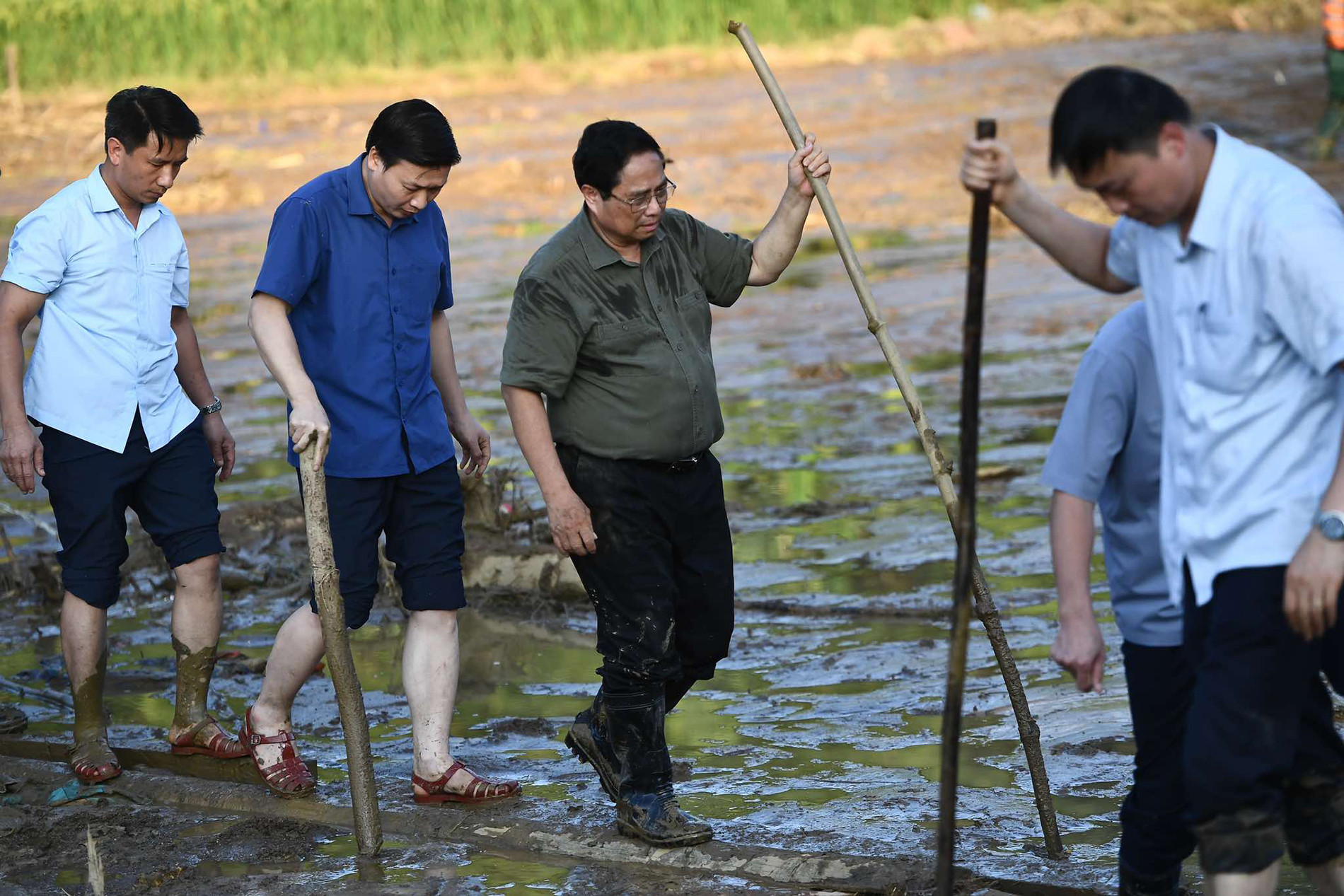 Với đôi ủng lấm lem, người dính bùn đất, Thủ tướng Phạm Minh Chính lội bộ đến tận nơi, ân cần hỏi thăm, động viên người dân và các lực lượng đang dọn dẹp phố phường còn ngổn ngang sau những ngày lũ lụt ngập nước mênh mông ở Yên Bái.