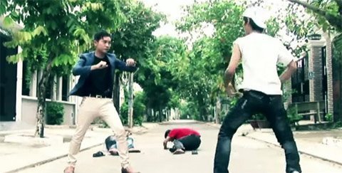 | Thạc sĩ tâm lý Nguyễn Hoàng Khắc Hiếu (bìa trái) thể hiện vài thế võ để bạn gái có thể thoát hiểm khi bị "yêu râu xanh' quấy rối - Ảnh: chụp từ clip "Đối phó với yêu râu xanh" |