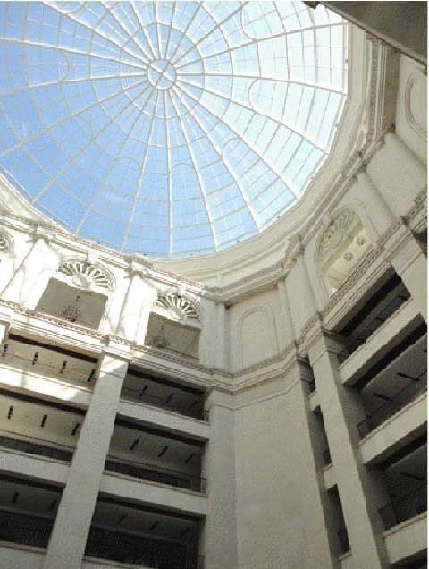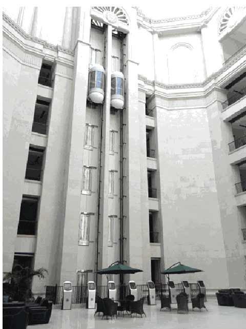 Từ ngoài nhìn vào, có thể thấy sự đồ sộ của nó với 10 cột trụ to ở hành lang phía trước dễ làm ta liên tưởng đến hình ảnh của nhà Trắng.Kiến trúc đỉnh hình bầu dục, tất cả các cửa sổ và cửa ra vào đều được làm bằng gỗ màu tím.