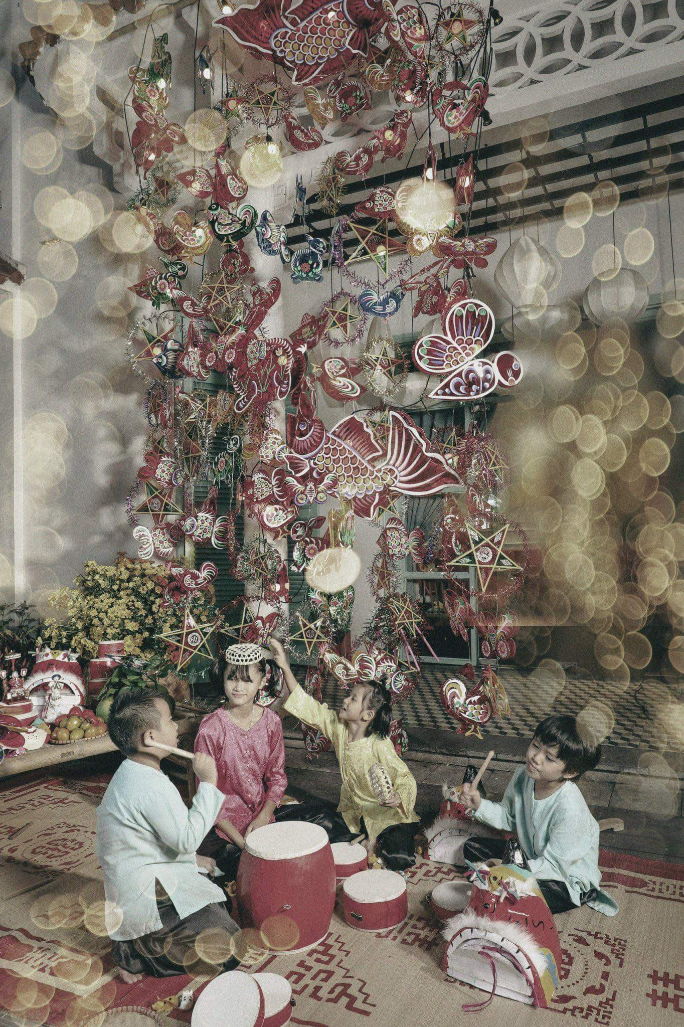 Góc sân ngập nắng thu thoảng hương hoàng lan ngọt mát, có khu chơi ô ăn quan, bọn trẻ chơi chắt, chơi chuyền. Dưới tán cây già, những con giống bột tinh xảo được nhào nặn qua bàn tay tài hoa của nghệ nhân, góc kia ông dậy làm đèn kéo quân, bên này trẻ con xúm xít vào vẽ mặt nạ… Những gánh hàng hoa, rồi nào bưởi, nào hồng, bà nhanh tay lấy những lớp lá sen, bọc cốm giót dẻo thơm, hương của cốm lẫn trong hương của thị. Cả mẹt thị vàng ươm cô Tấm, mẹ vui tay dậy con đan rọ, chỉ thế thôi là cả tuổi thơ năm cũ đã tràn về…
