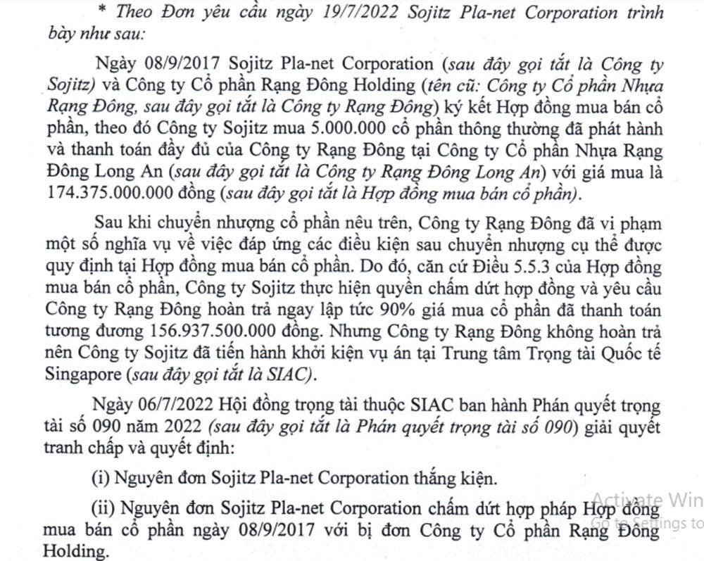 Theo đó, Rạng Đông Holding đã thua kiện cổ đông ngoại Sojitz Pla-net Corporation (thuộc Tập đoàn Sojitz - Nhật Bản) và phải trả lại gần 157 tỷ đồng cùng các khoản phí, lệ phí liên quan.