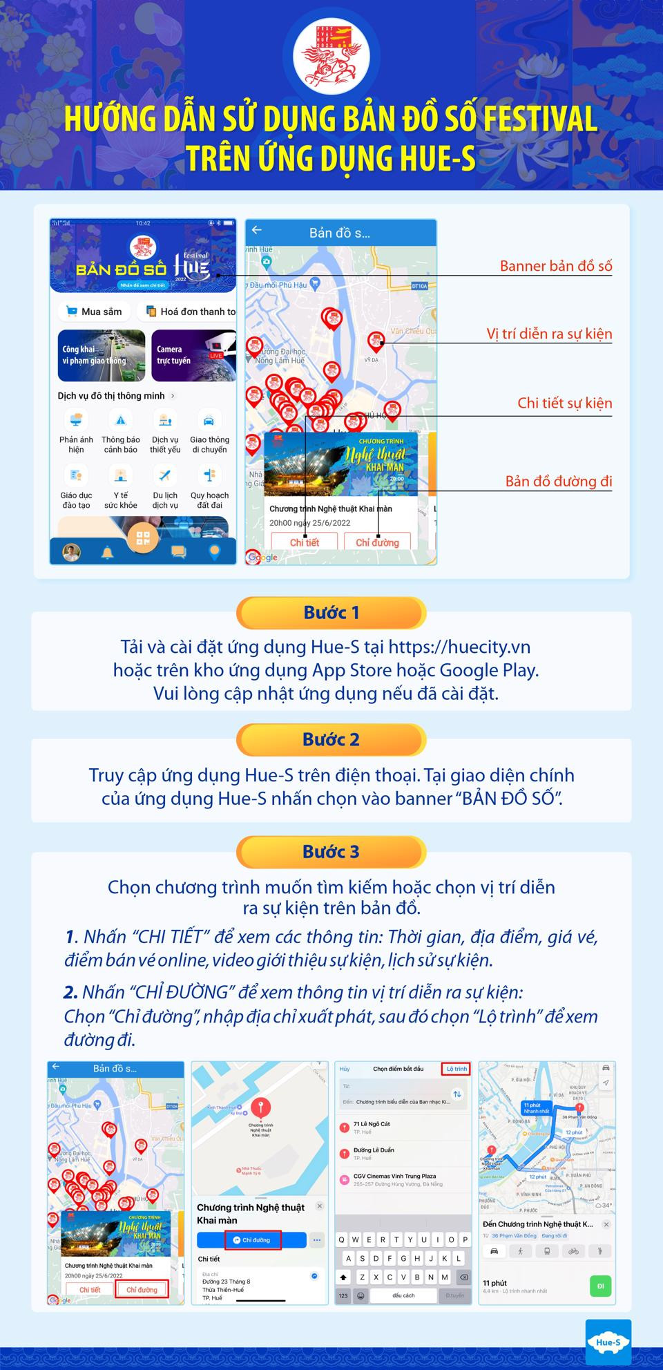 Người dân và du khách tham dự Festival Huế 2022 có thể cài đặt ứng dụng Hue-S trên điện thoại di động theo từ khóa tìm kiếm "Hue-S" trên các kho ứng dụng hoặc từ địa chỉ https://huecity.vn.