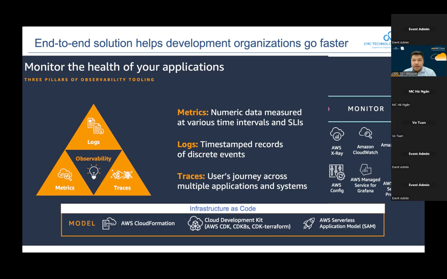 Tại hội thảo về hiện đại hoá ứng dụng do Tổng Công ty Công nghệ và Giải pháp CMC cùng AWS tổ chức vừa qua, AWS mang đến bộ dịch vụ linh hoạt được thiết kế để giúp các công ty xây dựng và cung cấp sản phẩm nhanh hơn, tin cậy hơn bằng các biện pháp thực hành AWS và DevOps. Những dịch vụ này giúp đơn giản hóa quá trình cung cấp và quản lý cơ sở hạ tầng, triển khai mã ứng dụng, tự động hóa các quy trình phát hành phần mềm và theo dõi hiệu suất của ứng dụng cũng như cơ sở hạ tầng.