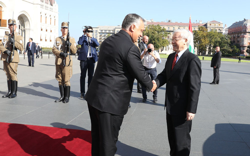 Thủ tướng Hungary Viktor Orbán chủ trì Lễ đón chính thức Tổng Bí thư Nguyễn Phú Trọng tại Nhà Quốc hội ở Thủ đô Budapest ngày 12/9/2018