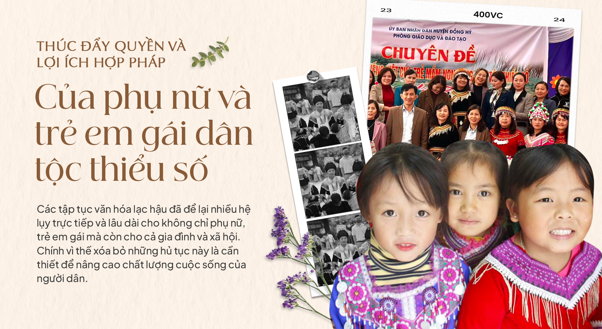 Tại Việt Nam, các vùng dân tộc thiểu số thường gặp nhiều khó khăn hơn so với các vùng dân số khác bởi các định kiến và rào cản văn hóa. Mặc dù đã có nhiều tiến bộ, song tại một số nơi, vẫn còn phụ nữ và trẻ em gái dân tộc thiểu số vẫn đang phải đối mặt với nhiều quan niệm, hủ tục lạc hậu ảnh hưởng đến việc thụ hưởng quyền con người.
