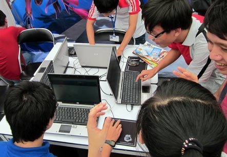 Các bạn trẻ hào hứng tại một gian hàng sản phẩm Internet.