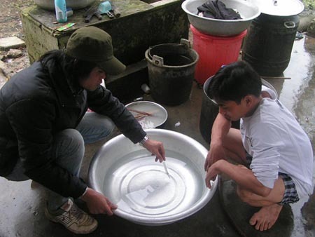 | Phóng viên đo nhiệt độ nước giếng vào ngày 7/4 |