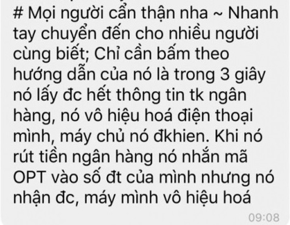 Cùng đó, các thông tin lan truyền cũng cảnh báo mọi người "hãy nhanh tay chia sẻ cho nhiều người dùng biết", "nhanh lên và chuyển tiếp cho nhiều người dùng hơn", hay "ai từng chuyển khoản qua điện thoại, xin hãy chú ý và chia sẻ cho nhiều người dùng biết".