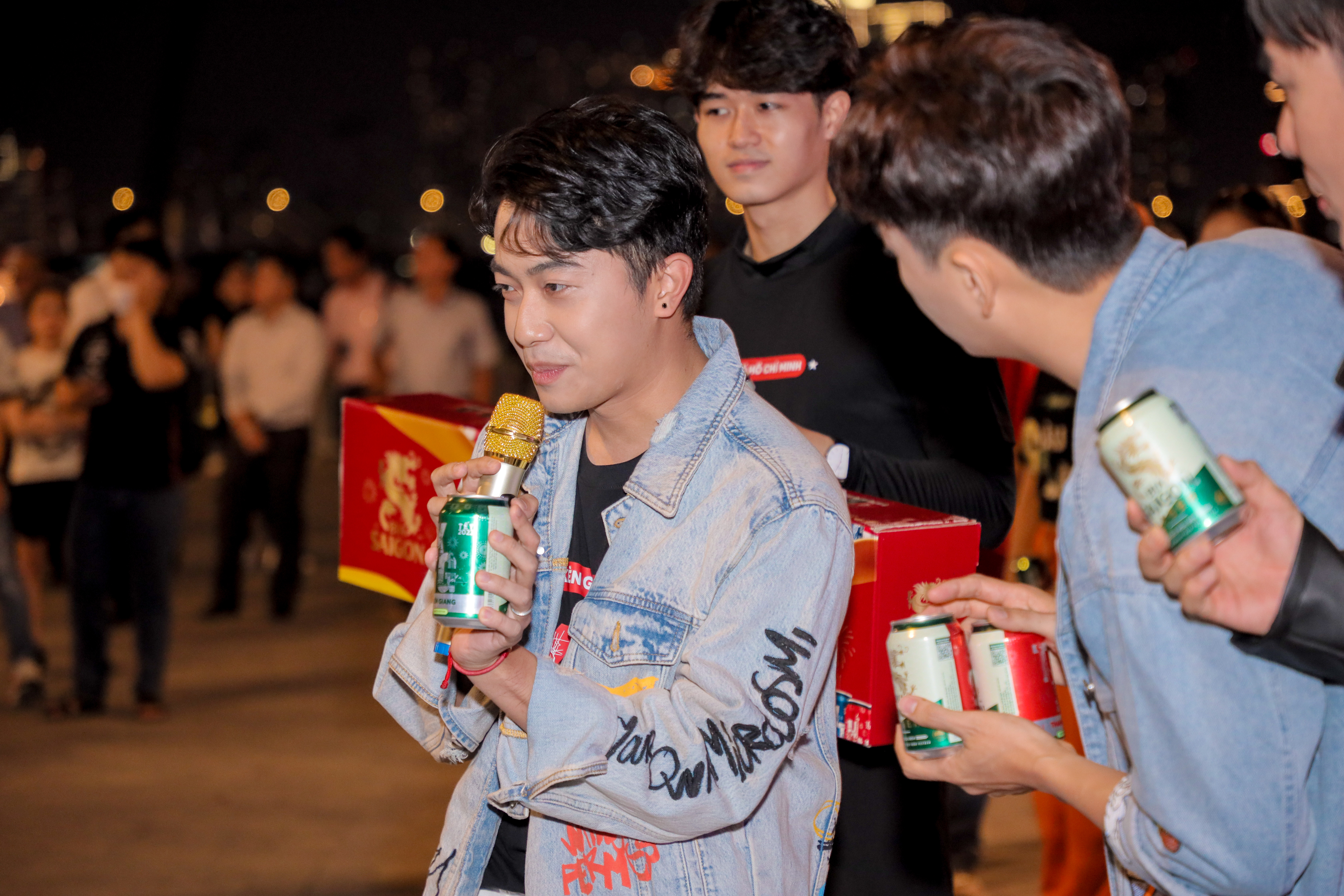Chung vui với sự kiện độc đáo này, nhiều sao Việt như Lê Dương Bảo Lâm, Cris Phan, Ngô Kiến Huy cũng góp mặt để giao lưu với người hâm mộ. Ba anh chàng xuất hiện với vai trò đặc biệt khi là người “mở khóa” thùng bia khổng lồ của Bia Saigon. Đây cũng là bộ sưu tập lon bia giới hạn mang tên “63 là 1” được thương hiệu ra mắt trong dịp Tết năm nay.