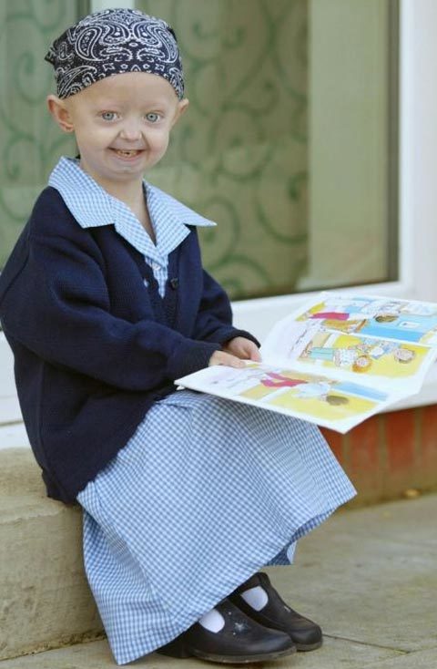 | Cô bé Hayley Okines mắc hội chứng HGPS trong ngày đầu tiên đi học lúc 4 tuổi, năm 2002. Ảnh: Daily Mail. |