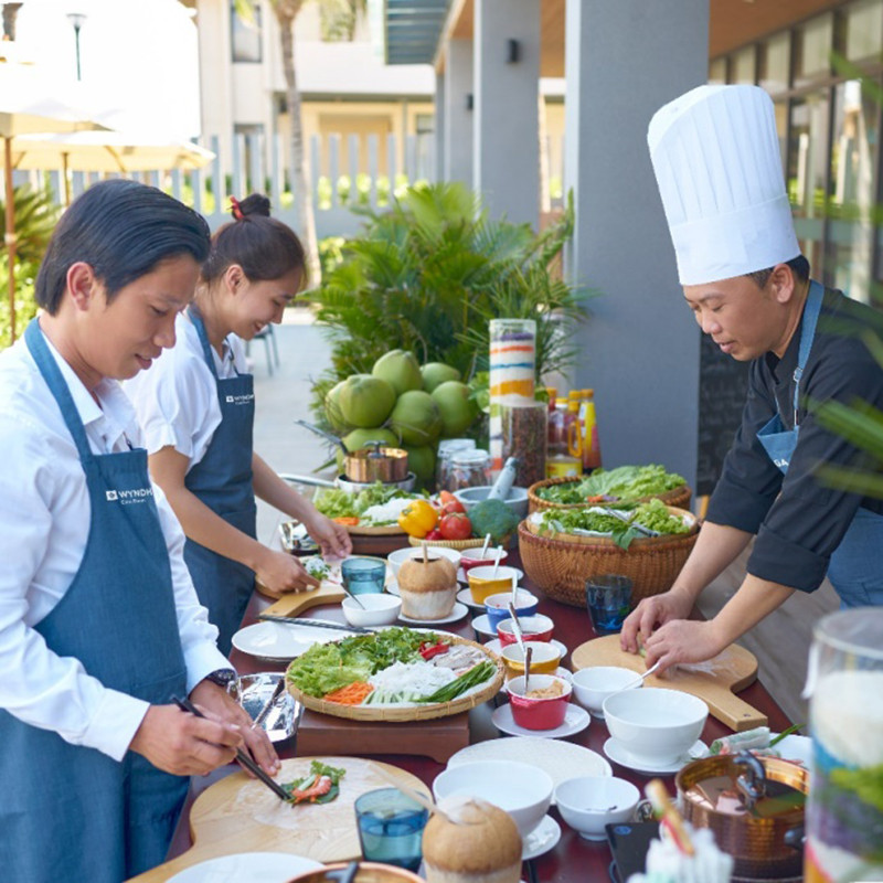 Một trong những hoạt động được yêu thích nhất là trải nghiệm nấu ăn tại Breeze Bar. Du khách có thể tham gia lớp học nấu ăn các món Việt như: phở, cá kho tộ, gỏi bưởi tôm thịt...; giúp gắn kết yêu thương và khám phá văn hóa ẩm thực tuyệt vời.
