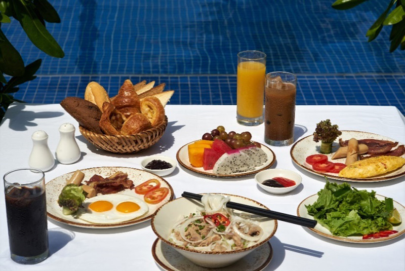Sau bữa sáng thảnh thơi, bữa trưa và tối sẽ phục vụ du khách với thực đơn món Á - Âu đặc sắc. Các món được bếp trưởng tại nhà hàng Breeze giới thiệu sẽ thay đổi hàng ngày theo nguồn nguyên liệu tươi mới nhất: có thể là thịt bò, cừu thượng hạng hay hải sản được đánh bắt trong ngày.
