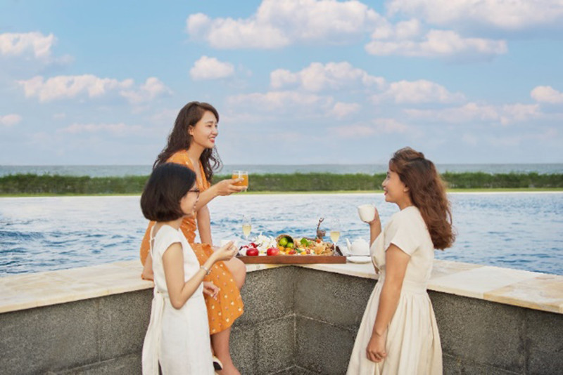 Cảm giác yên bình, thư giãn càng khắc sâu khi du khách tận hưởng buổi tiệc trà chiều kết hợp các món ngọt cổ truyền cùng món nhẹ kiểu Âu dưới nắng chiều lung linh và gió biển thổi nhẹ.