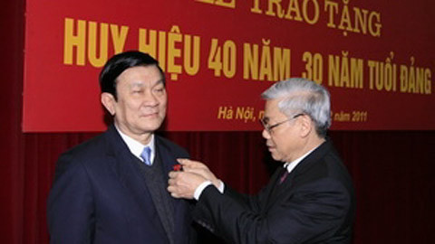 cho Thường trực Ban Bí thư Trương Tấn Sang và huy hiệu 30 năm tuổi Đảng cho 9 người khác.