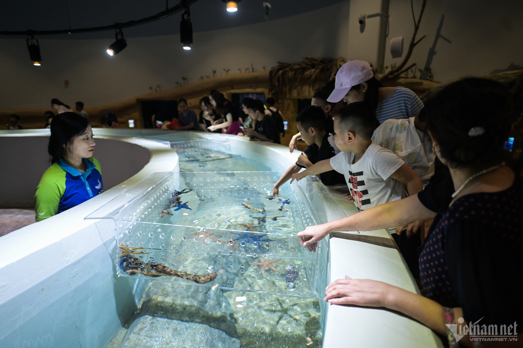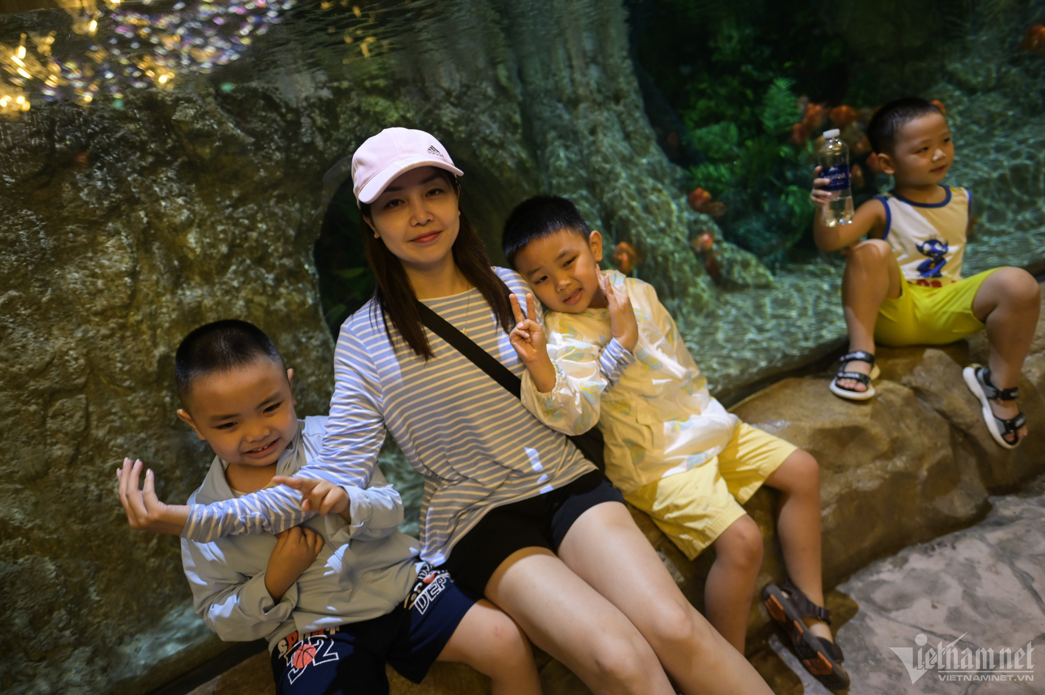 Chị Phạm Thu Hiền cùng gia đình đến thủy cung vui chơi cuối tuần. Chị cho biết, vì gia đình có con nhỏ nên thấy đây cũng là nơi hợp lý. "Trẻ con thì không nói làm gì, nhìn con vật, màu sắc thì tất nhiên chúng nó thích thú chứ với người lớn như tôi thì không hẳn. Điểm cộng ở đây là không gian rất rộng", chị Hiền nói.