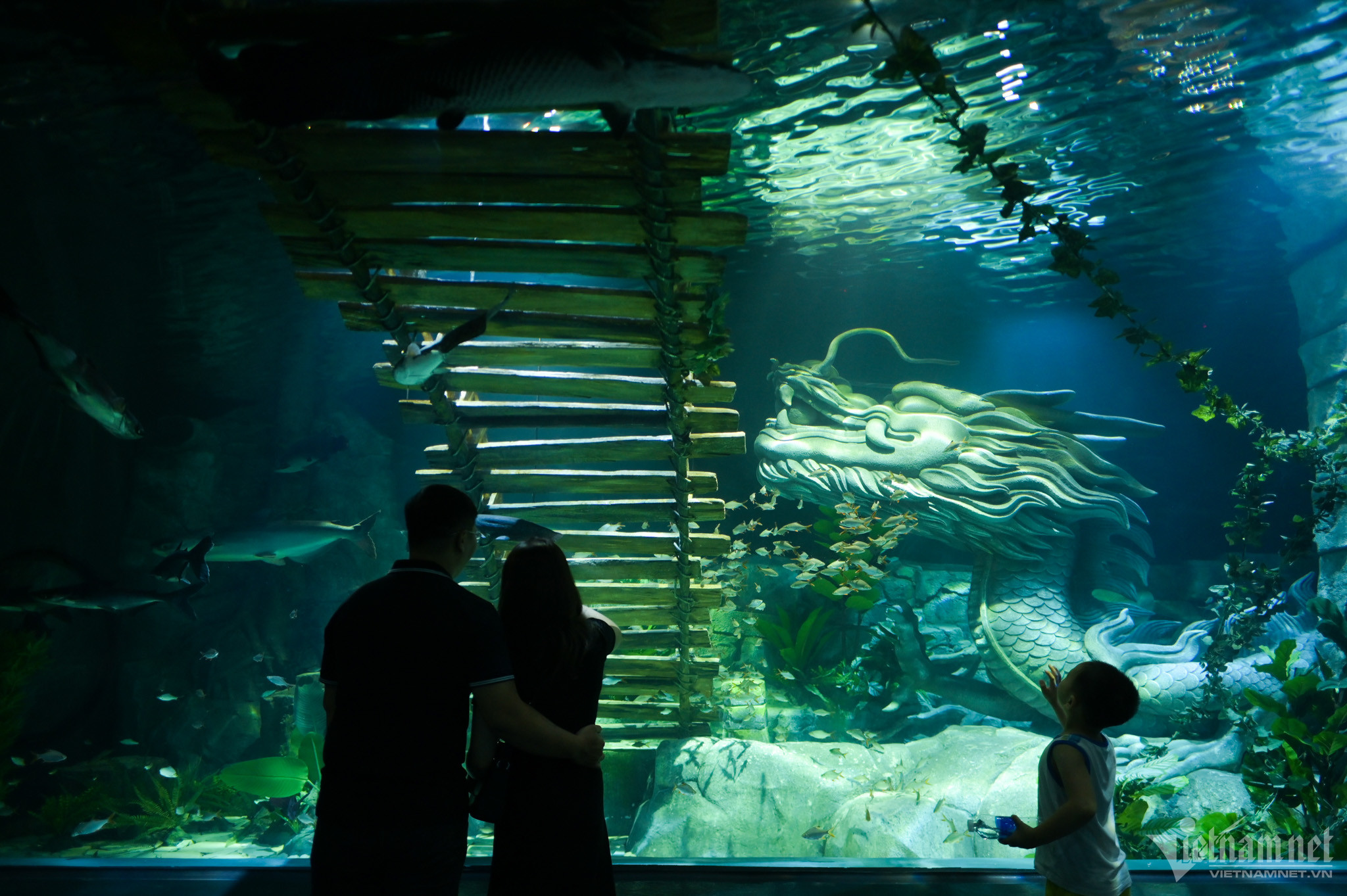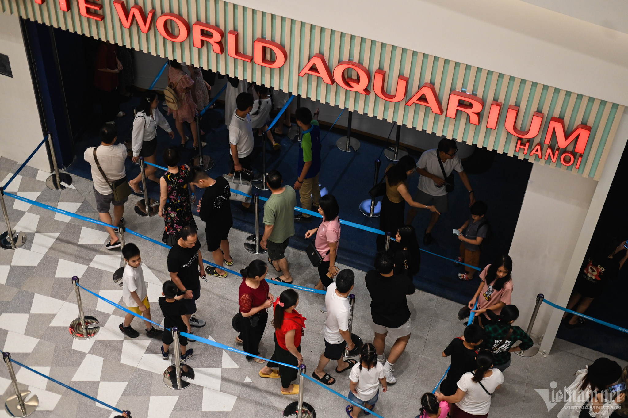 Thủy cung trong một TTTM mới mở ở quận Tây Hồ (khai trương ngày 1/8) hứa hẹn là địa điểm vui chơi, giải trí lý tưởng. Các buổi cuối tuần khá đông du khách xếp hàng chờ mua vé vào tham quan.