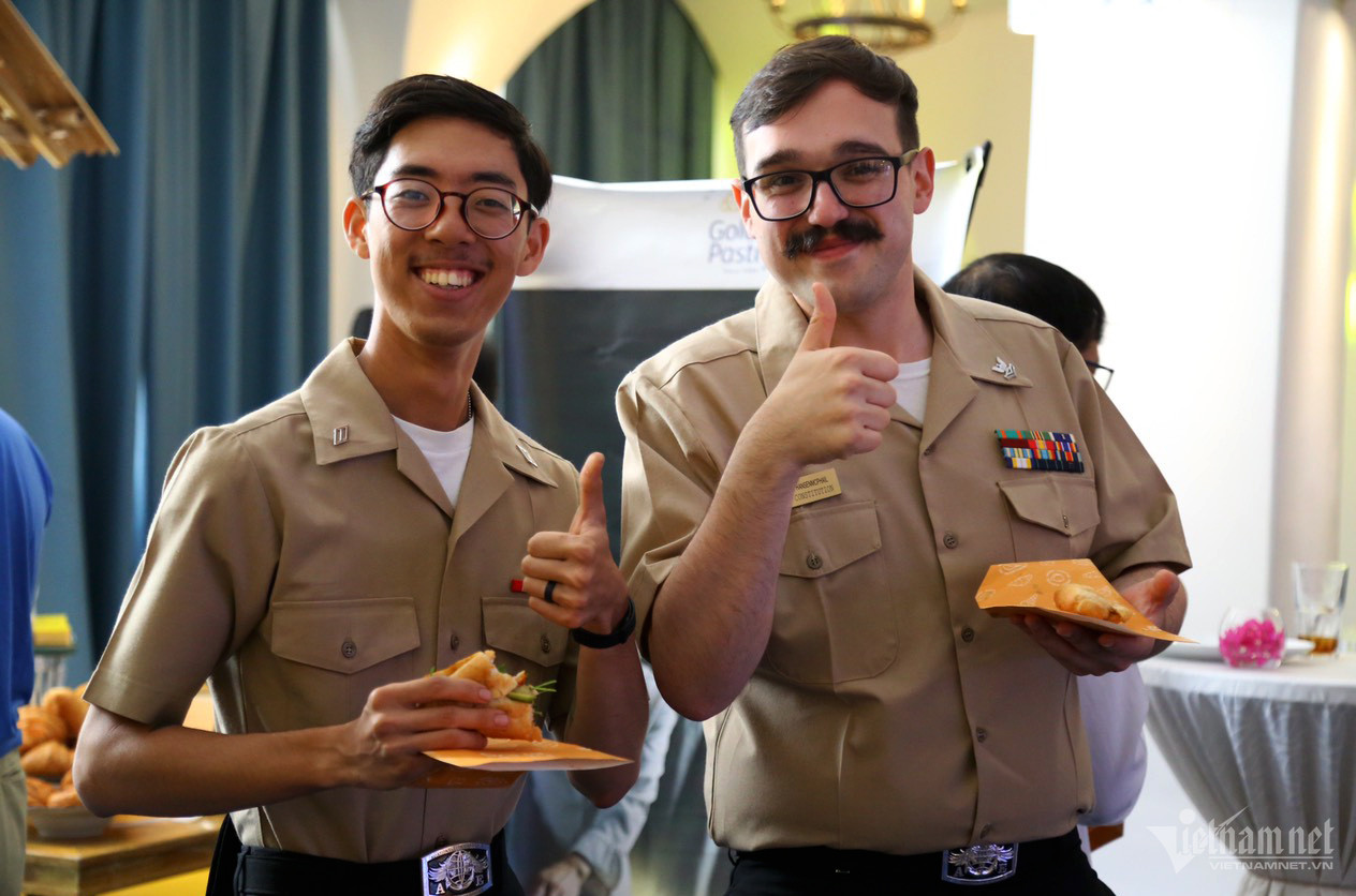 Các sĩ quan, thủy thủ tàu sân bay Mỹ thích thú học cách nấu món mì Quảng, thưởng thức bánh mì truyền thống Việt Nam.