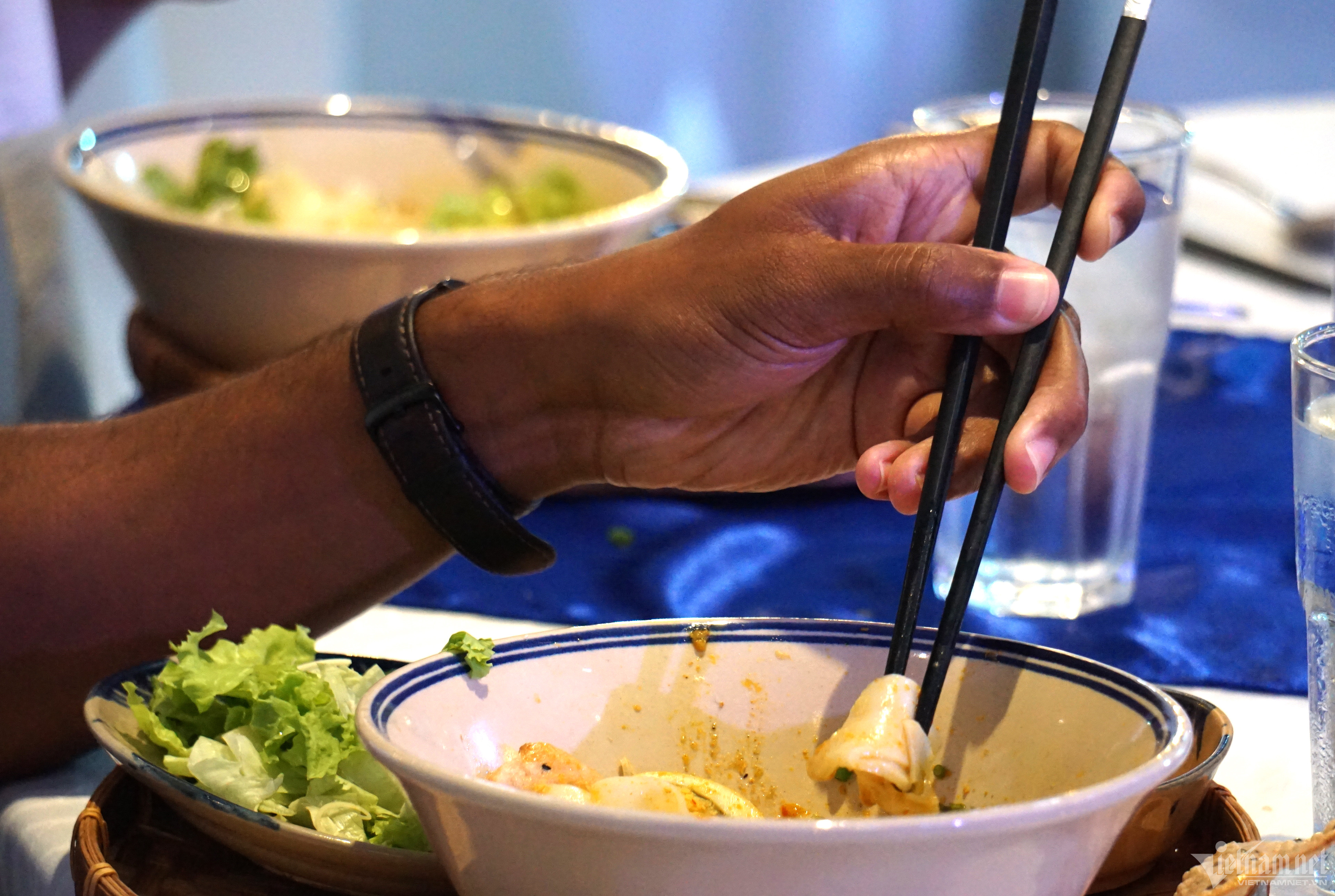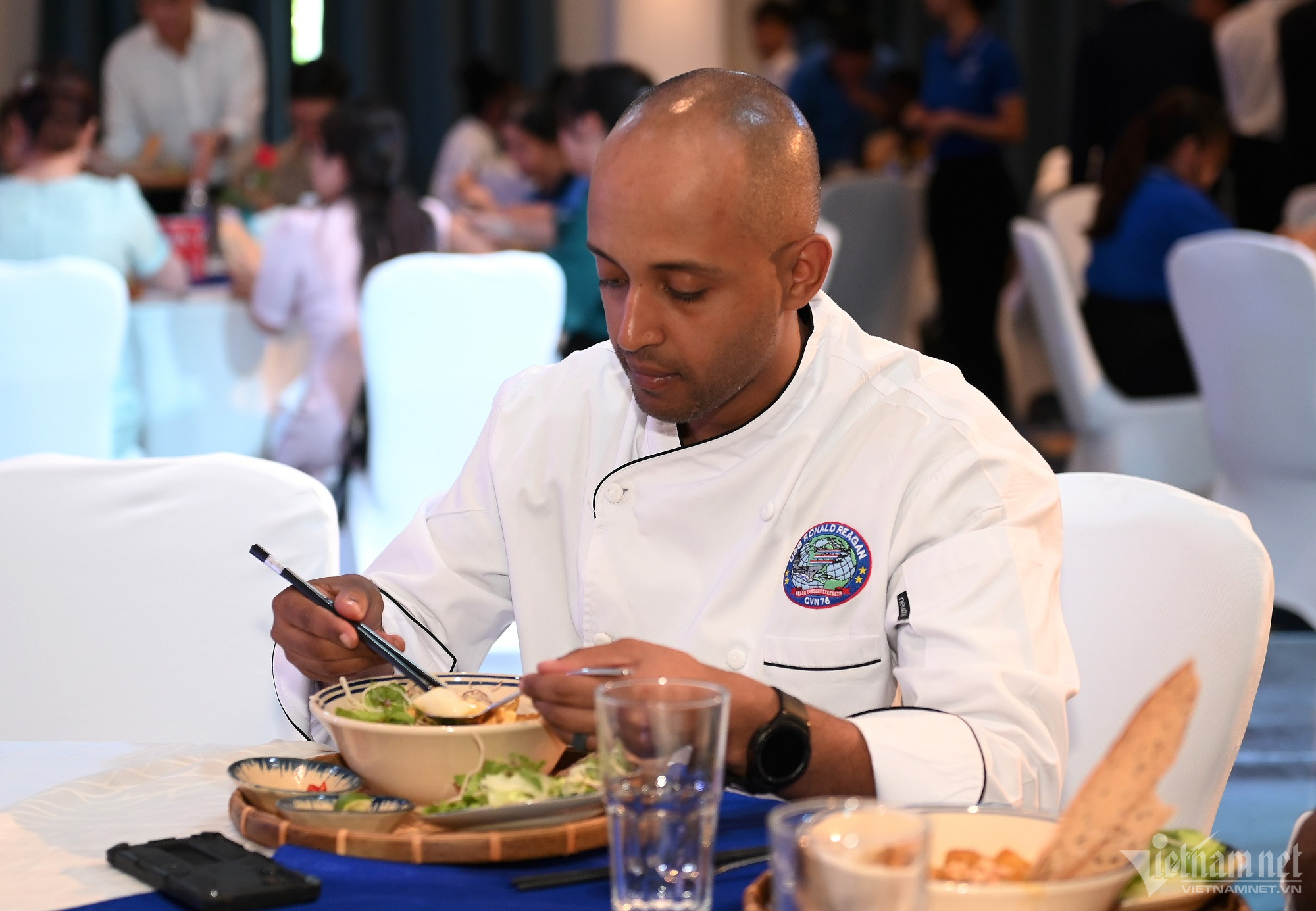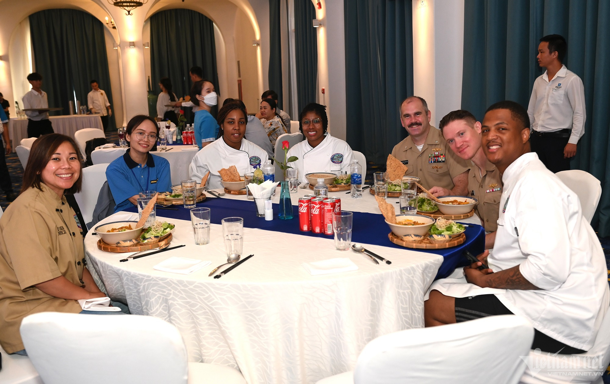 Thăm TP Đà Nẵng 5 ngày, các sĩ quan, thủy thủ thuộc nhóm tàu sân bay Mỹ USS Ronald Reagan trưa nay có buổi giao lưu ẩm thực tại một khách sạn trên đường Nguyễn Văn Thoại (quận Ngũ Hành Sơn).