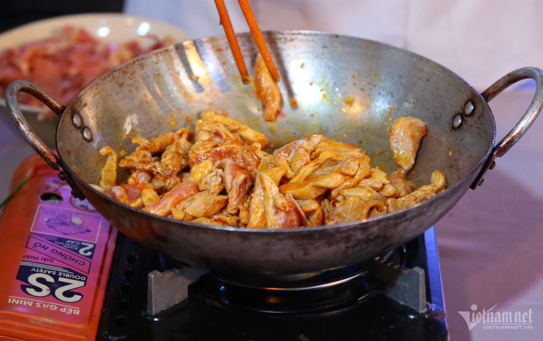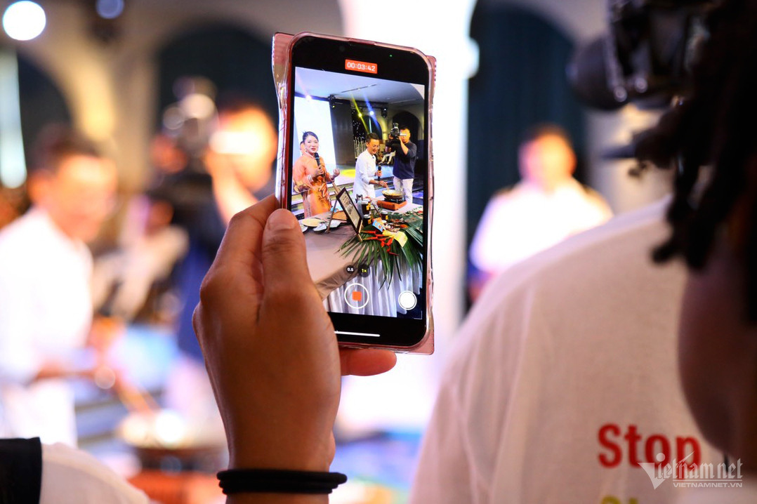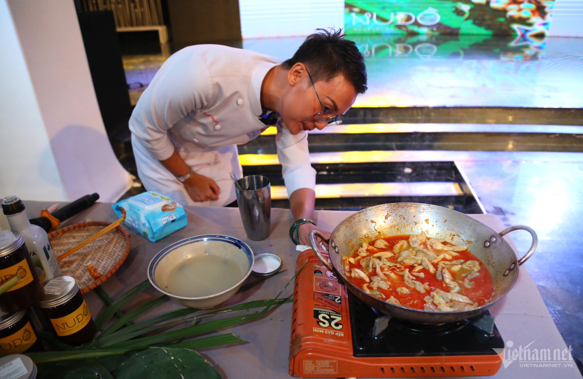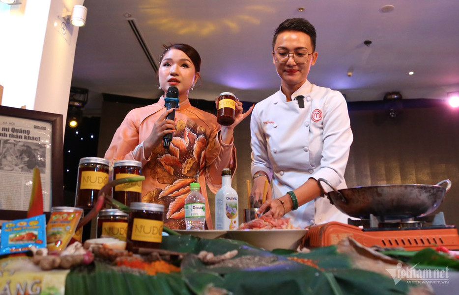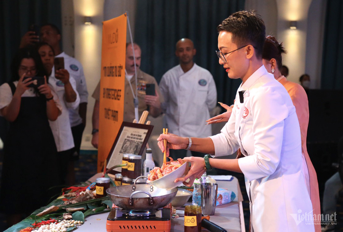 Trong buổi giao lưu ẩm thực, chef Tuyết Phạm giới thiệu và hướng dẫn nấu món mì Quảng cho các thủy thủ tàu sân bay Mỹ