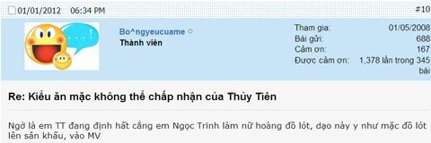 Tại webtretho, các thành viên cũng bàn tán xôn xao, có thành viên còn dùng những lời lẽ rất mạnh để chỉ trích bộ trang phục phản cảm của Thuỷ Tiên. Thành viên 13062009 cho rằng: “…Body em rất nuột, mặc gì cũng đẹp, thiếu gì bộ quần áo kín đáo vừa phải mà vẫn sexy, việc gì cứ phải hở ra nhiều thế làm gì vậy em?”. Bạn Bo^ngyeucuame thì hài hước: “Ngờ là em Thuỷ Tiên đang định hất cẳng em Ngọc Trinh làm nữ hoàng đồ lót, dạo này Thuỷ Tiên toàn mặc đồ lót lên sân khấu, vào MV”.