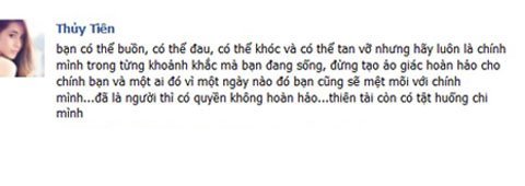 Ngay sau khi bị dư luận “ném đá” vì bộ trang phục phản cảm, Thuỷ Tiên đã lên trang cá nhân tâm sự: “Bạn có thể buồn, có thể đau, có thể khóc và có thể tan vỡ nhưng hãy luôn là chính mình trong từng khoảnh khắc mà bạn đang sống, đừng tạo ảo giác hoàn hảo cho chính bạn và một ai đó vì một ngày nào đó bạn cũng sẽ mệt mỏi với chính mình... đã là người thì có quyền không hoàn hảo... thiên tài còn có tật huống chi mình”.