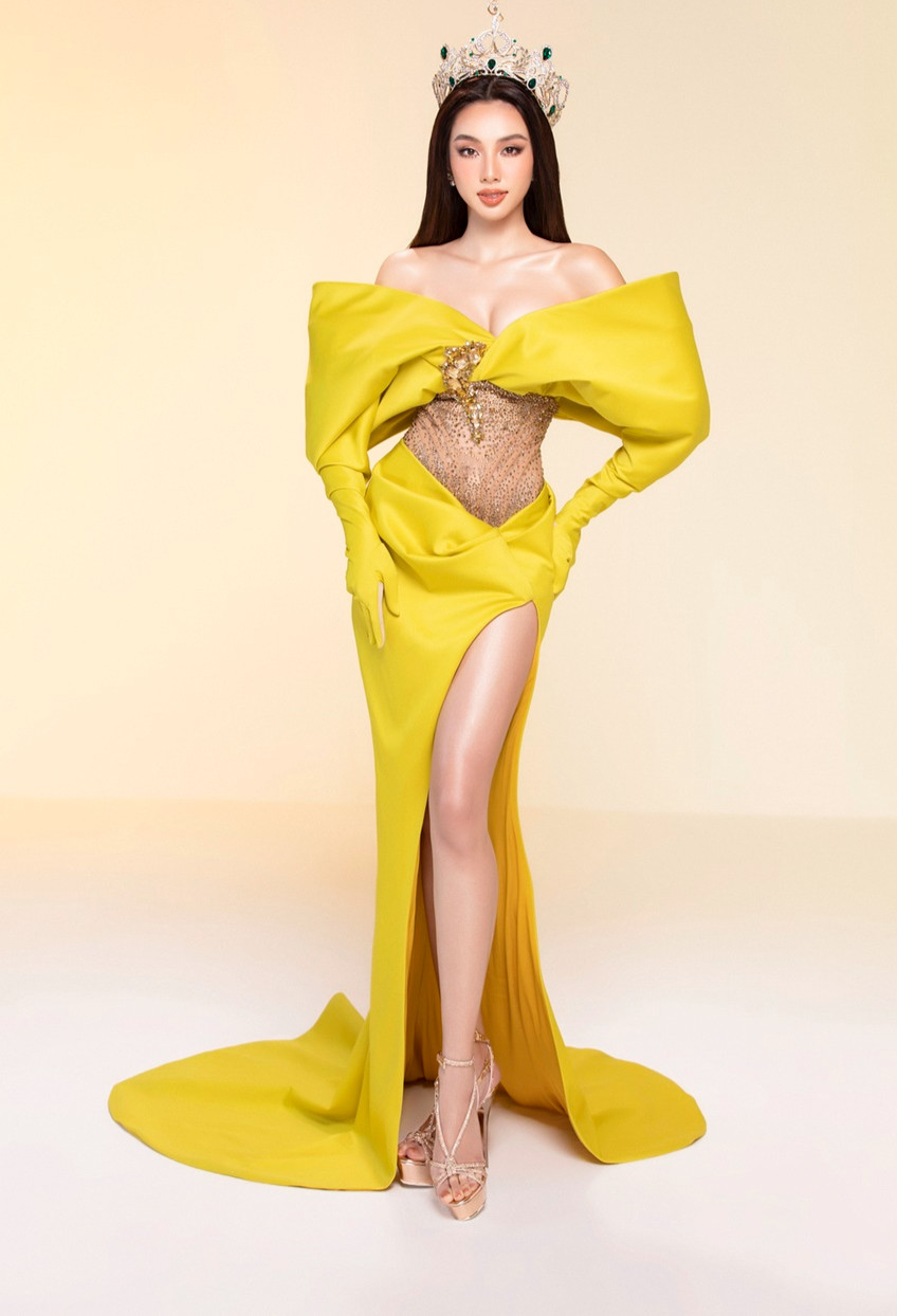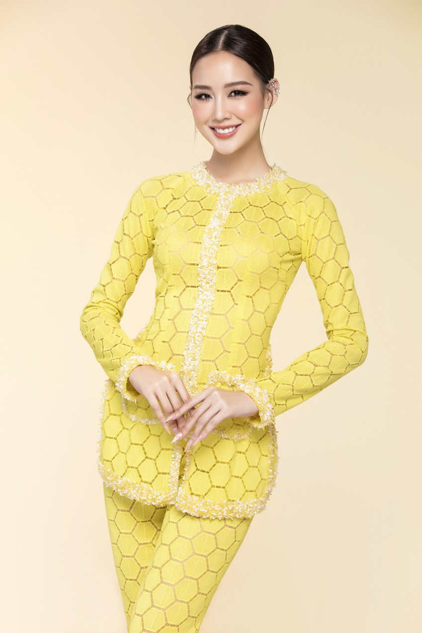 Hoa hậu Lương Thùy Linh diện trang phục tứ thân, tôn lên vóc dáng mảnh mai và những đường nét dịu dàng. Sự kết hợp giữa màu trắng và vàng cùng điểm nhấn bông hoa nở khiến cô duyên dáng hơn.
