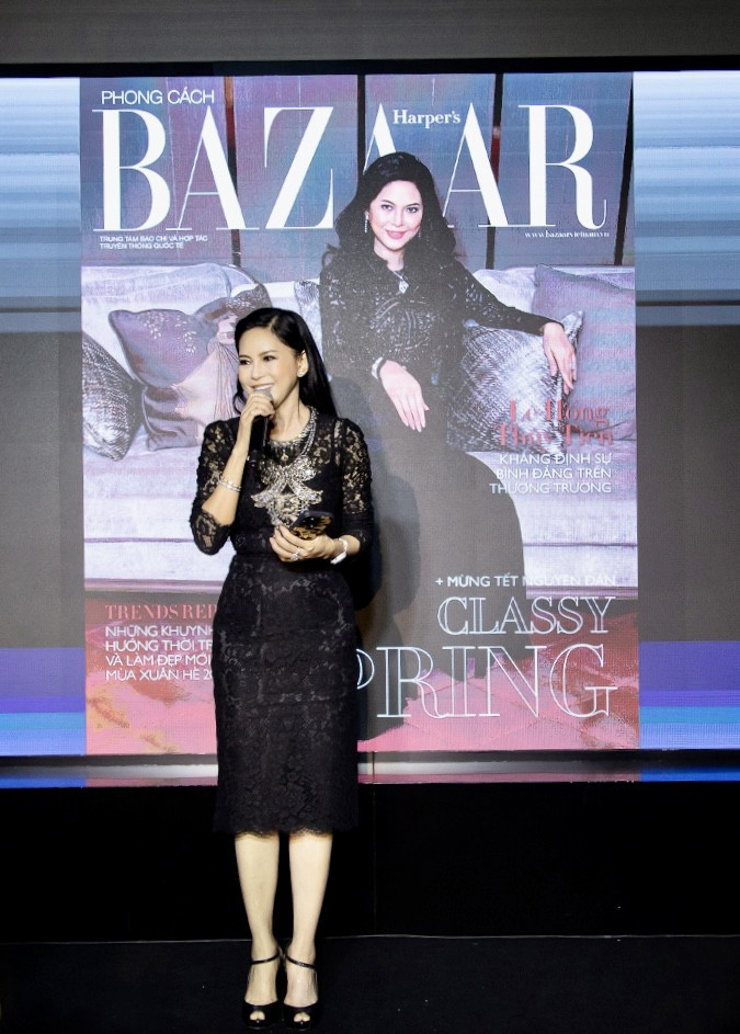 Thủy Tiên từ một nữ diễn viên xinh đẹp tài sắc chuyển mình thành doanh nhân quyền lực. Chị cũng là một trong những gương mặt trang bìa của Harper’s Bazaar Vietnam. Tại sự kiện mới đây, diễn viên Thuỷ Tiên diện thiết kế sang trọng với đầm đen từ Dolce & Gabbana kèm giày da cá sấu Christian Louboutin, đồng hồ trang sức kim cương Cartier. Tất cả đều là phiên bản giới hạn.