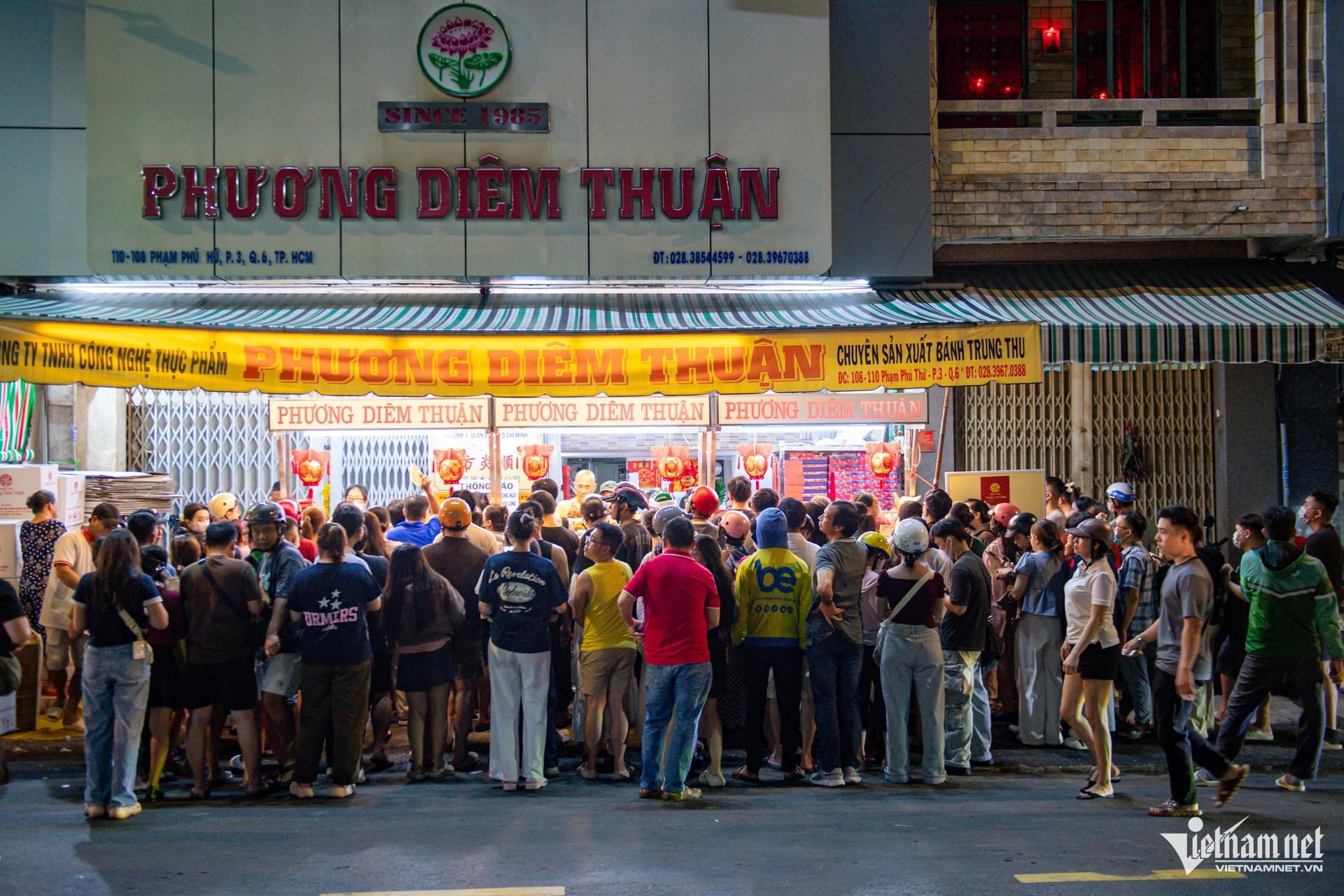 Một tiệm bánh trung thu trên đường Phạm Phú Thứ, phường Bình Tiên, TPHCM, khách xếp hàng dài mua bánh về biếu, thắp hương ngày đầu tháng Tám âm lịch.