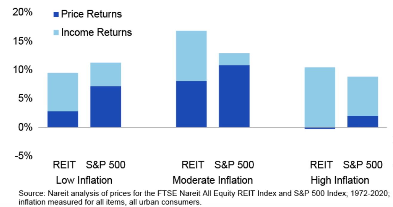 Thống kê của Hiệp hội REIT Hoa Kỳ cho thấy, lợi nhuận của REIT vượt trội so với S&P 500 (chỉ số đại diện cho thị trường chứng khoán Mỹ) đến 56%/năm khi lạm phát cao và hơn 80%/năm khi lạm phát ở mức vừa phải.