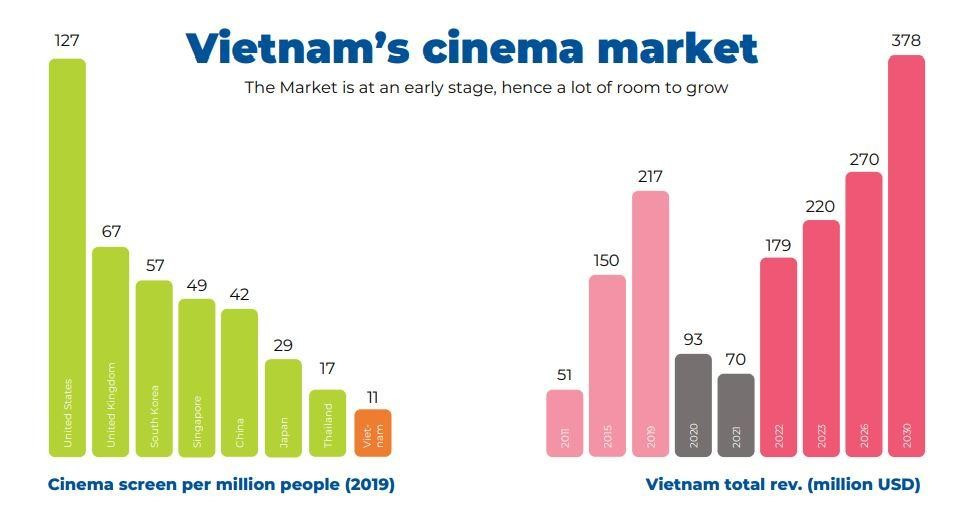 Theo đánh giá của nhóm nghiên cứu, trước Covid-19, thị trường rạp phim tại Việt Nam đã có sự tăng trưởng nhanh chóng và phục hồi mạnh mẽ vào năm 2022. Tổng doanh thu dự kiến tăng trưởng với tốc độ CAGR ~10% trong 8 năm tới. Doanh thu trung bình trên mỗi người dùng (ARPU) hiện là $8-9.