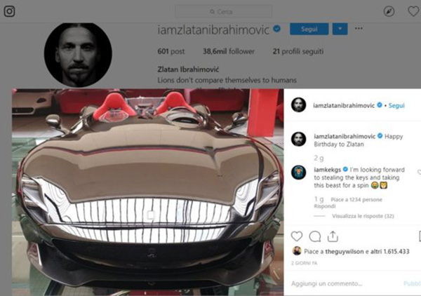 Trên trang instagram cá nhân, tiền đạo này đã đăng ảnh chiếc siêu xe Ferrari Monza SP2 mui trần 2 chỗ ngồi, kèm lời bình luận: "Chúc mừng sinh nhật Zlatan".