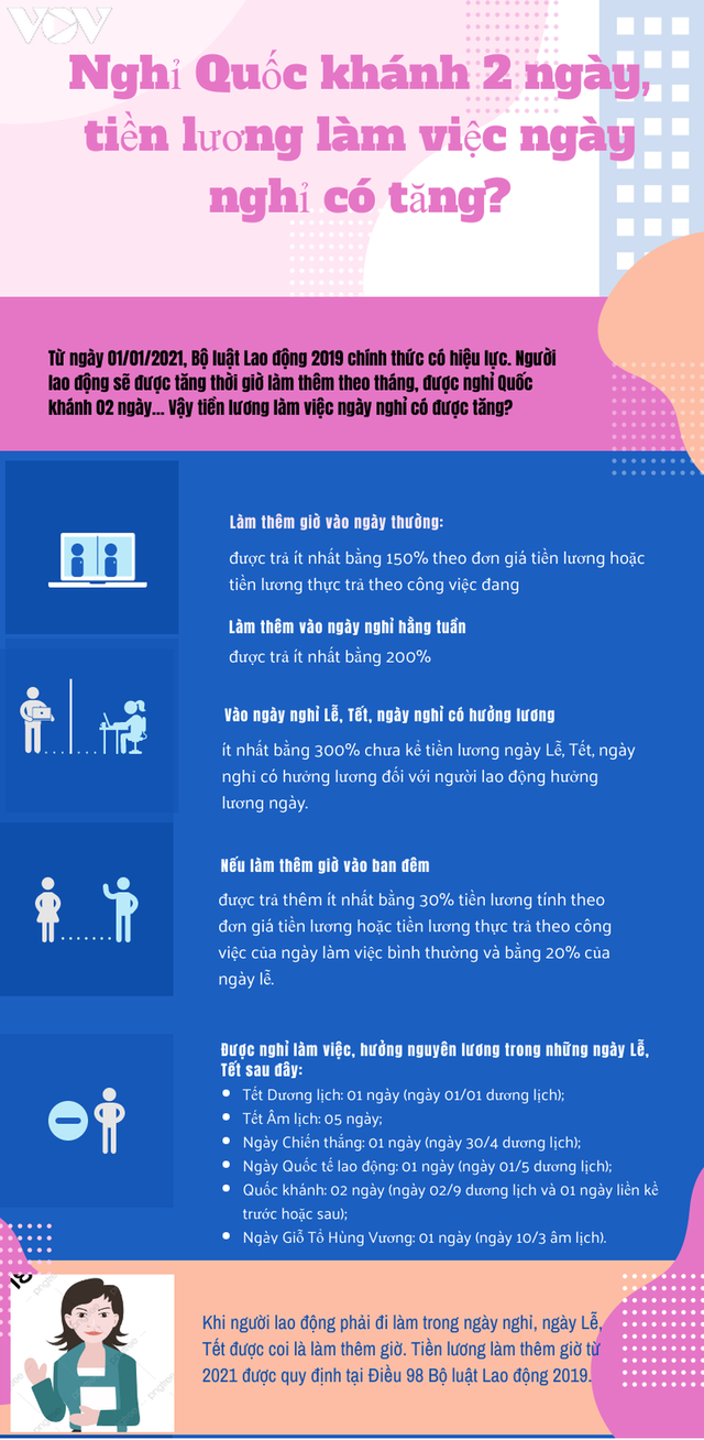 Từ năm 2021, người lao động sẽ được tăng thời giờ làm thêm theo tháng, được nghỉ Quốc khánh 2 ngày…Vậy tiền lương ngày nghỉ sẽ tính như thế nào?