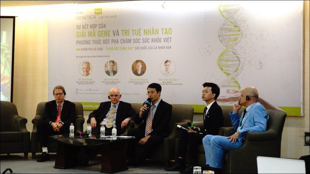 Ông Cao Anh Tuấn (cầm micro), cùng các diễn giả khác tại hội thảo của Genetica. |