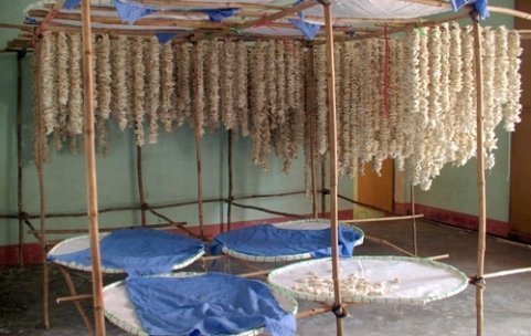 "10 ký kén thì hết 8 ký rưỡi là nhộng rồi. Nếu tôi tìm được nơi tiêu thụ nhộng, với giá khoảng 30 ngàn một ký, bằng giá cá tạp ngoài chợ thôi, thì người dân ăn không cái bông (tơ) rồi", ông Cường cười lớn.