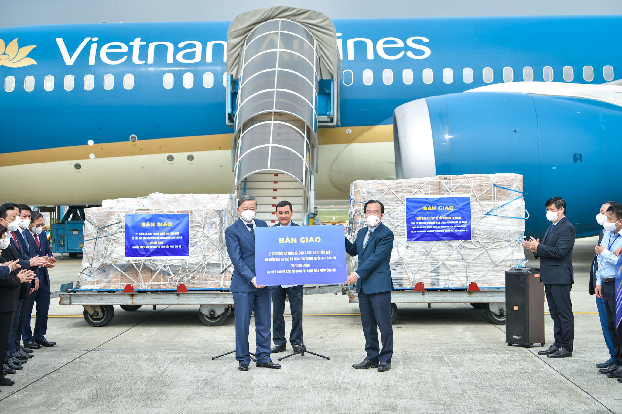 Ngay sau khi chuyên cơ của Thủ tướng hạ cánh, Lễ bàn giao, tiếp nhận sự ủng hộ quý báu này diễn ra trang trọng tại Sân bay Quốc tế Nội bài với sự tham dự của Ủy viên Bộ Chính trị, Bộ trưởng Bộ Công an Tô Lâm; các thành viên chính thức của đoàn công tác; Phó Chủ tịch Ủy ban Trung ương Mặt trận Tổ quốc Việt Nam Ngô Sách Thực; Bộ trưởng Bộ Y tế Nguyễn Thanh Long;…